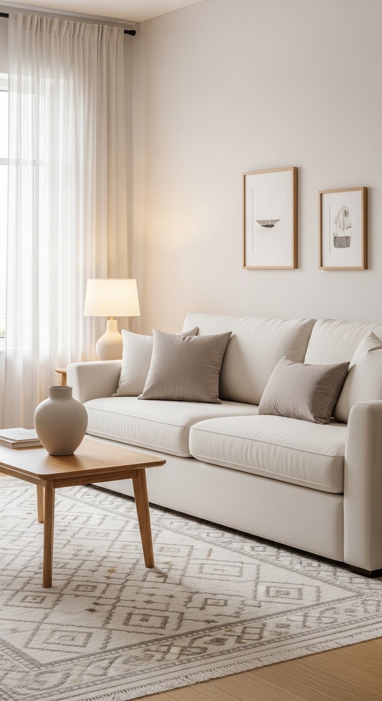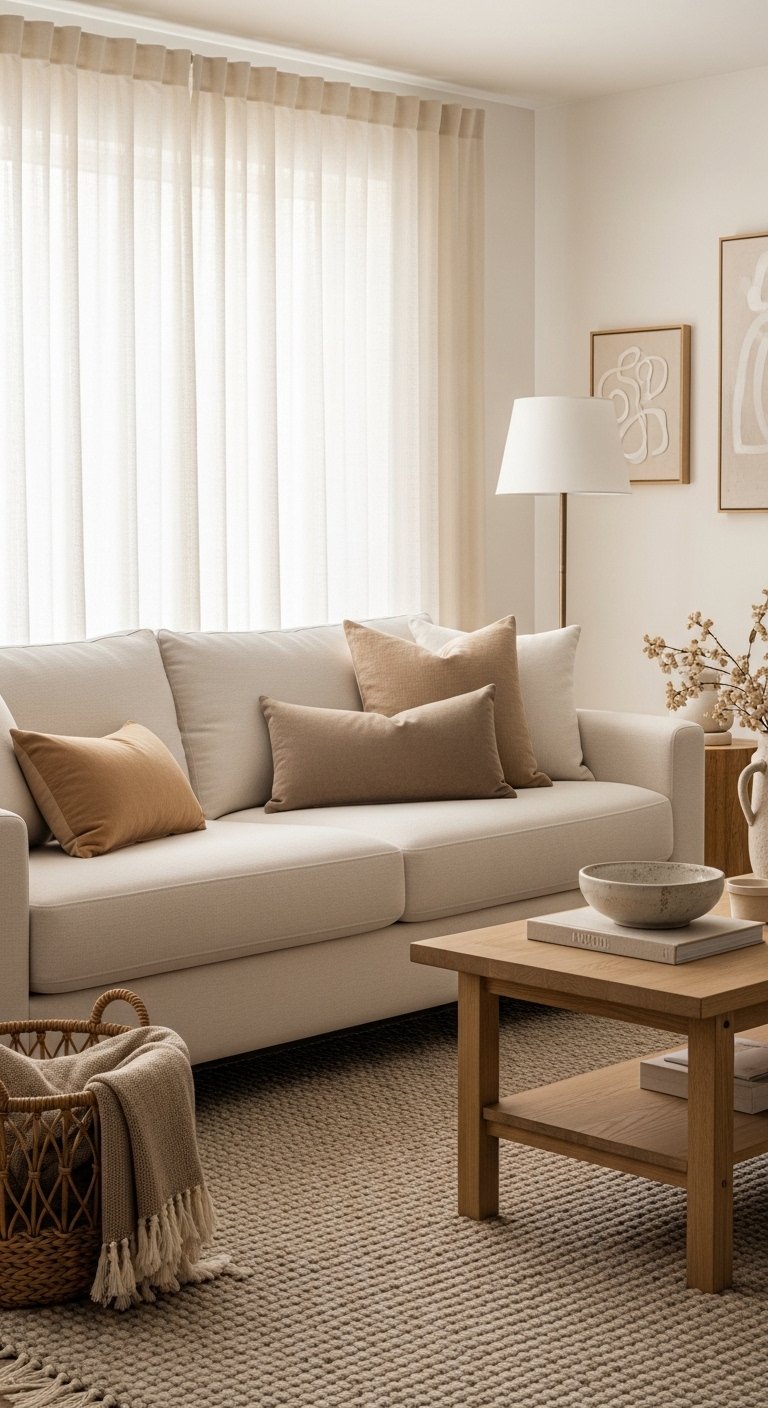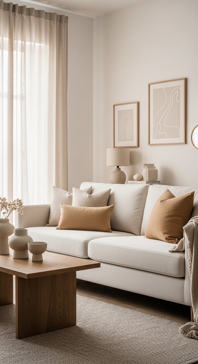 1. Cream Sofa with Warm Beige Layers and Soft Wood Accents