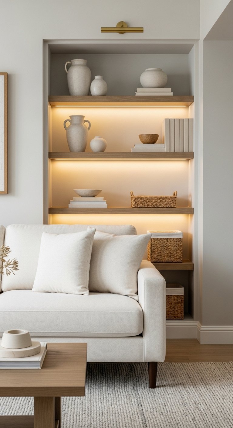 Style built in shelves behind or beside a cream sofa using soft neutral decor. Use ceramic vases, stacked books, and small woven baskets in beige and cream tones. Keep spacing airy so shelves do not look crowded. Add a few warm wood elements to introduce contrast. Use subtle lighting inside shelves to create depth in the evening. Place a textured rug under the sofa to ground the seating area. Choose neutral pillows to maintain cohesion. This arrangement frames the cream sofa beautifully. The shelves add visual interest without strong color. The overall effect feels tailored, elegant, and calm while keeping the room soft and welcoming.
