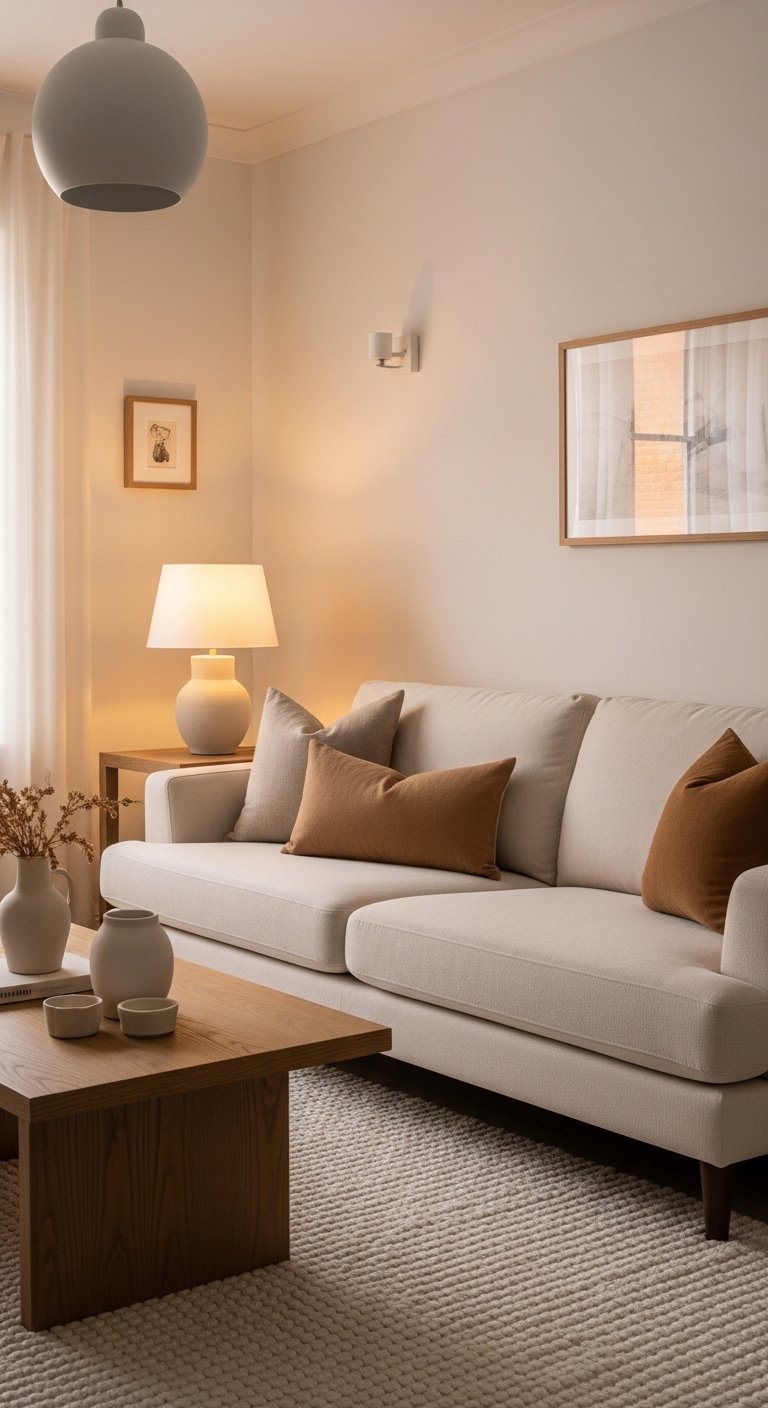 20. Cream Sofa with Soft Ambient Lighting for Evening Warmth