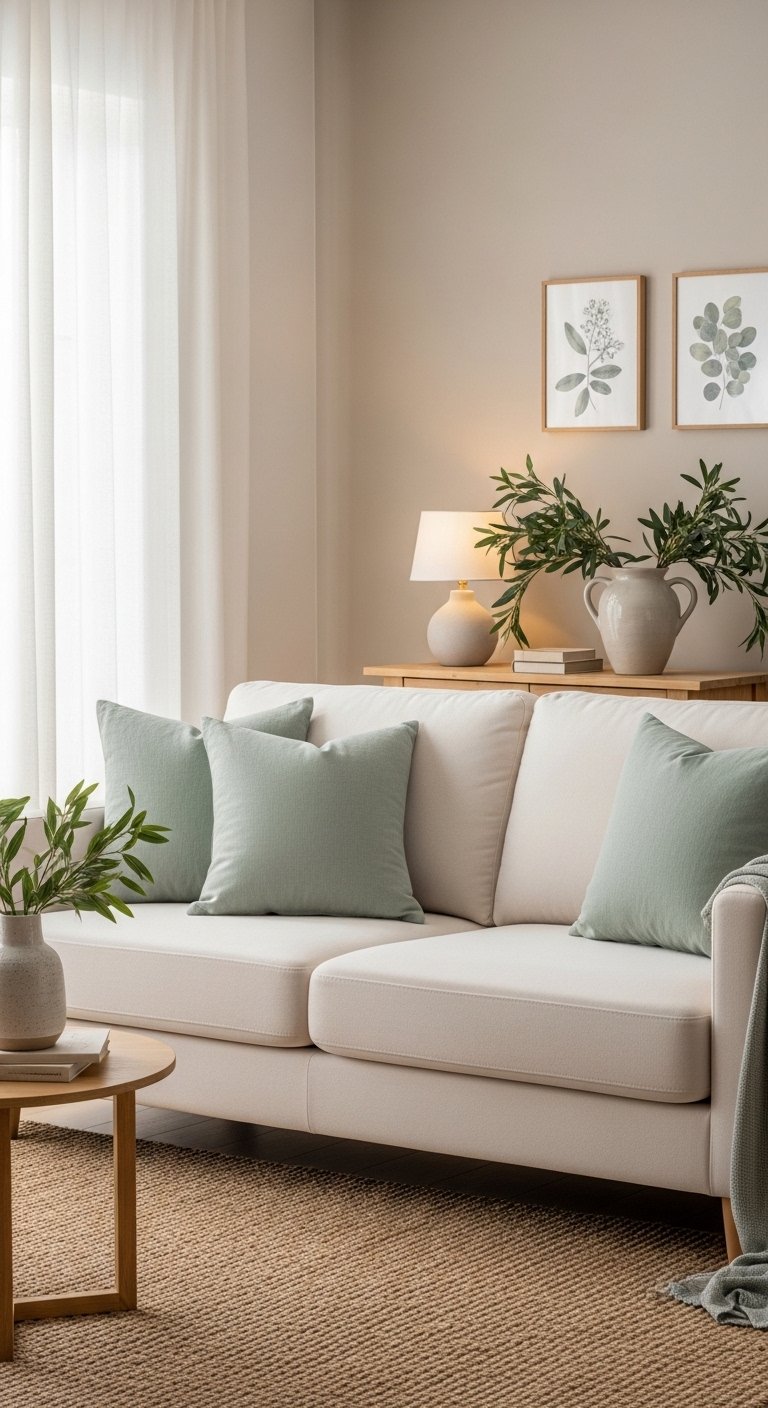 2. Cream Sofa with Soft Sage Green and Natural Textures