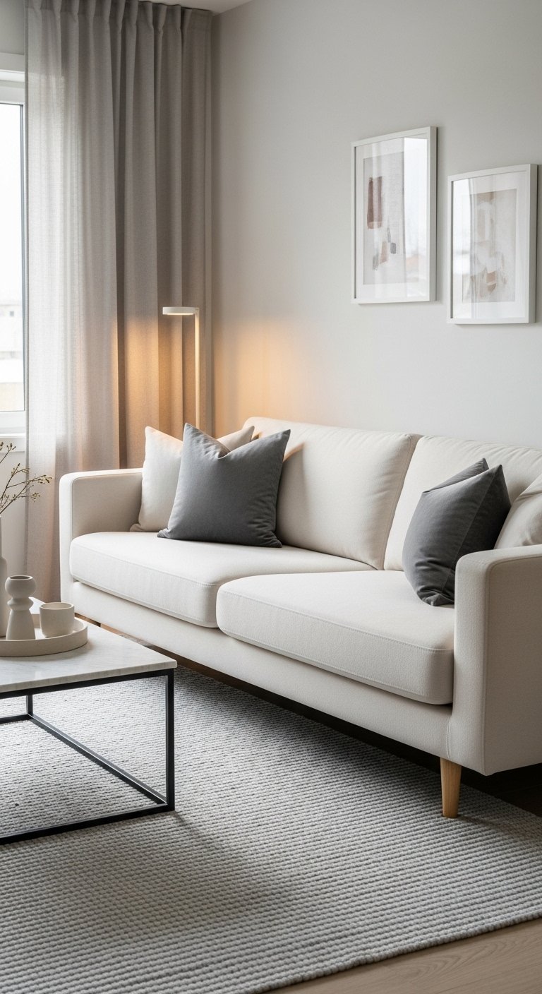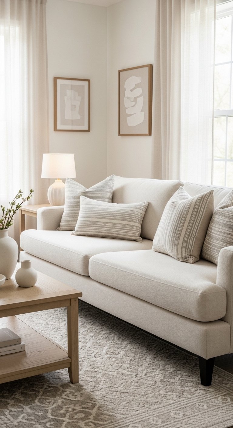 Create a soft luxury living room by layering different shades of white around a cream sofa. Use a plush off white rug to add comfort and visual softness. Add textured pillows in boucle, knit, and linen to build depth without introducing strong color. A white or light stone coffee table keeps the palette cohesive and airy. Use a tall ceramic lamp with a fabric shade to create warm ambient lighting. Hang minimal artwork in soft neutral tones to maintain a calm backdrop. Keep window treatments light and flowing to allow natural brightness. Add a soft throw draped casually over one arm of the sofa for a relaxed feel. This monochrome neutral approach feels elegant and high end. The key is mixing textures so the space never feels flat while letting the cream sofa remain the focal point.
