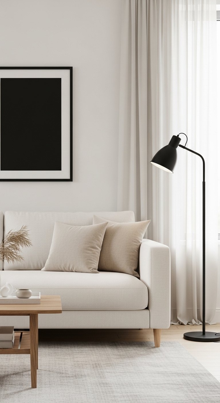 Add small black accents around a cream sofa to create refined contrast without losing softness. Choose black framed artwork above the sofa to define the space. Add a light neutral rug to keep the room bright. A black metal floor lamp introduces structure while remaining minimal. Use cream and beige pillows to soften the contrast. A wooden coffee table helps balance the darker details. Keep walls warm white to maintain the elegant feel. Add one or two black decor pieces like a tray or vase for cohesion. This idea creates a modern look without feeling harsh. The cream sofa softens the black accents, resulting in a balanced and polished living room.