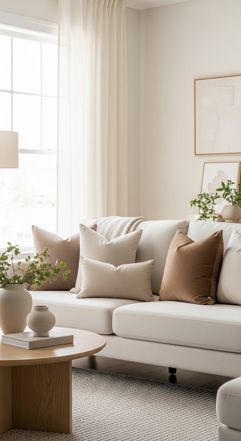 1. Cream Sofa with Warm Beige Layers and Soft Wood Accents