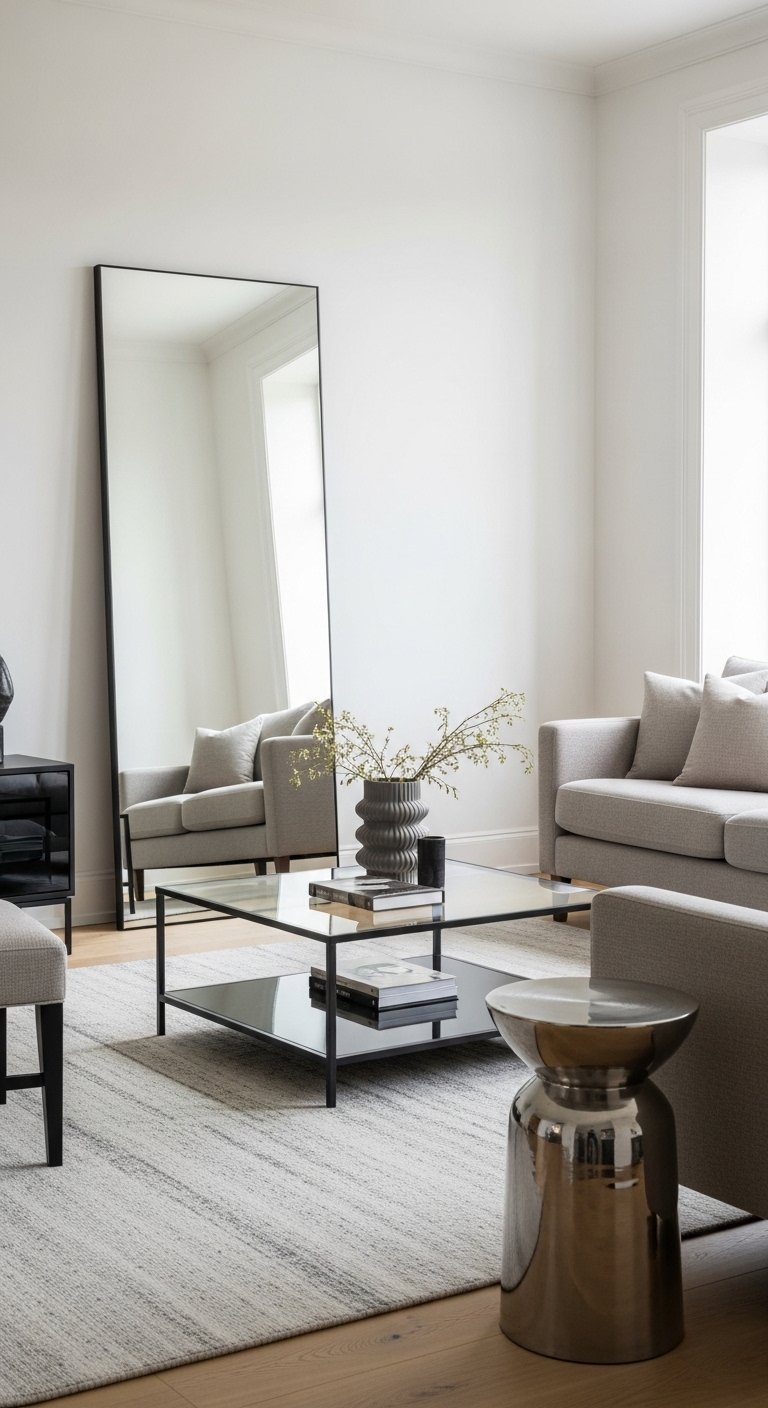 Incorporate mirrors, glass, or metallic accents to enhance natural light and create a sense of openness. A large floor mirror can double the perception of space while reflecting stylish furniture arrangements. Glass coffee tables, acrylic chairs, or chrome accents add a light, airy feel without compromising style. Reflective surfaces also highlight surrounding textures and colors, making each design element pop. This technique is highly pin-worthy because it demonstrates how modern living rooms can feel both spacious and sophisticated.
