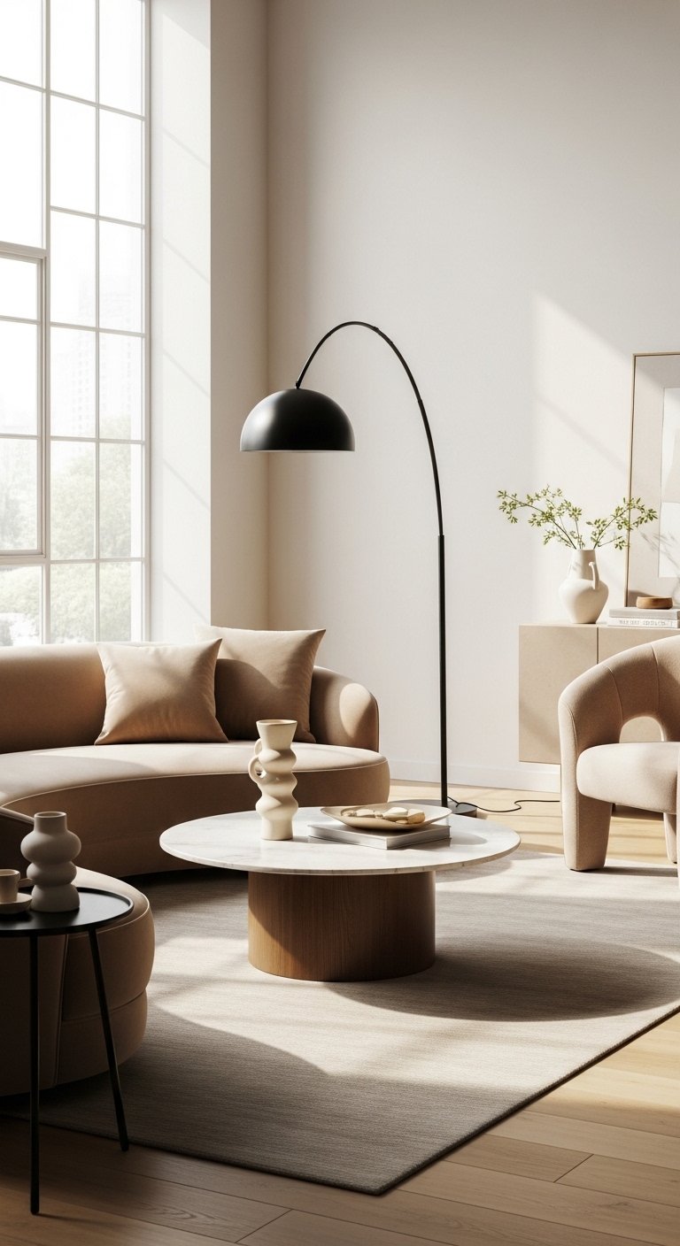 Break away from rigid lines by introducing curved furniture pieces, like a rounded sofa, circular coffee table, or arched armchair. Curves soften the overall look, making a modern space feel approachable and inviting while retaining sophistication. Combine curved shapes with angular décor elements—such as geometric shelving or linear lighting—to create a balanced contrast. Soft fabrics like velvet or boucle add tactile richness, and placing curved pieces near large windows maximizes natural light, resulting in an effortlessly chic, Pinterest-worthy layout.