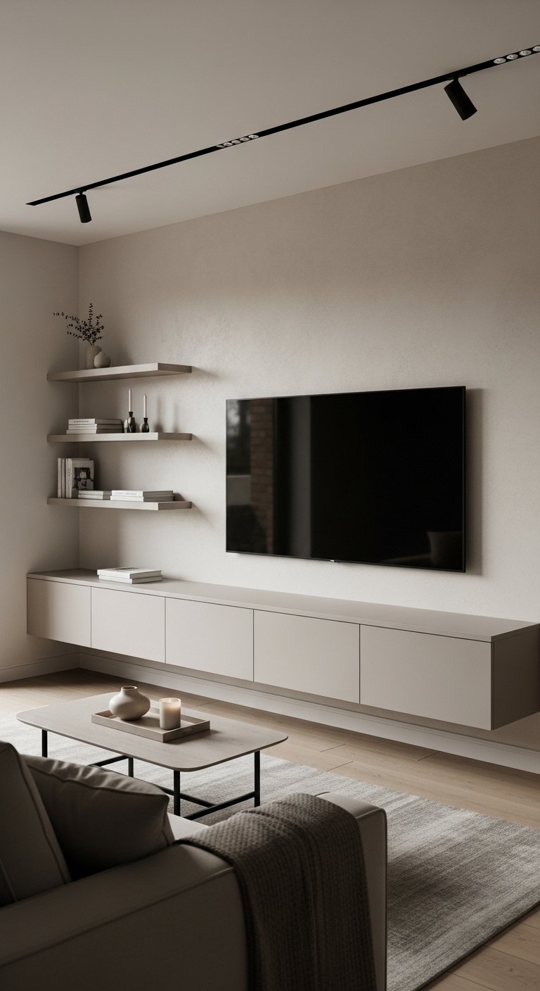 Streamline entertainment with a minimalist media wall. Mount the TV flush against a textured or monochrome wall, and hide cables and consoles behind cabinetry. Floating shelves or recessed niches display decorative objects without overcrowding the space. A minimalist media wall keeps the room clean, modern, and uncluttered, emphasizing architectural lines while ensuring functionality. This approach balances technology with style, perfect for readers seeking sleek, modern living room inspiration.