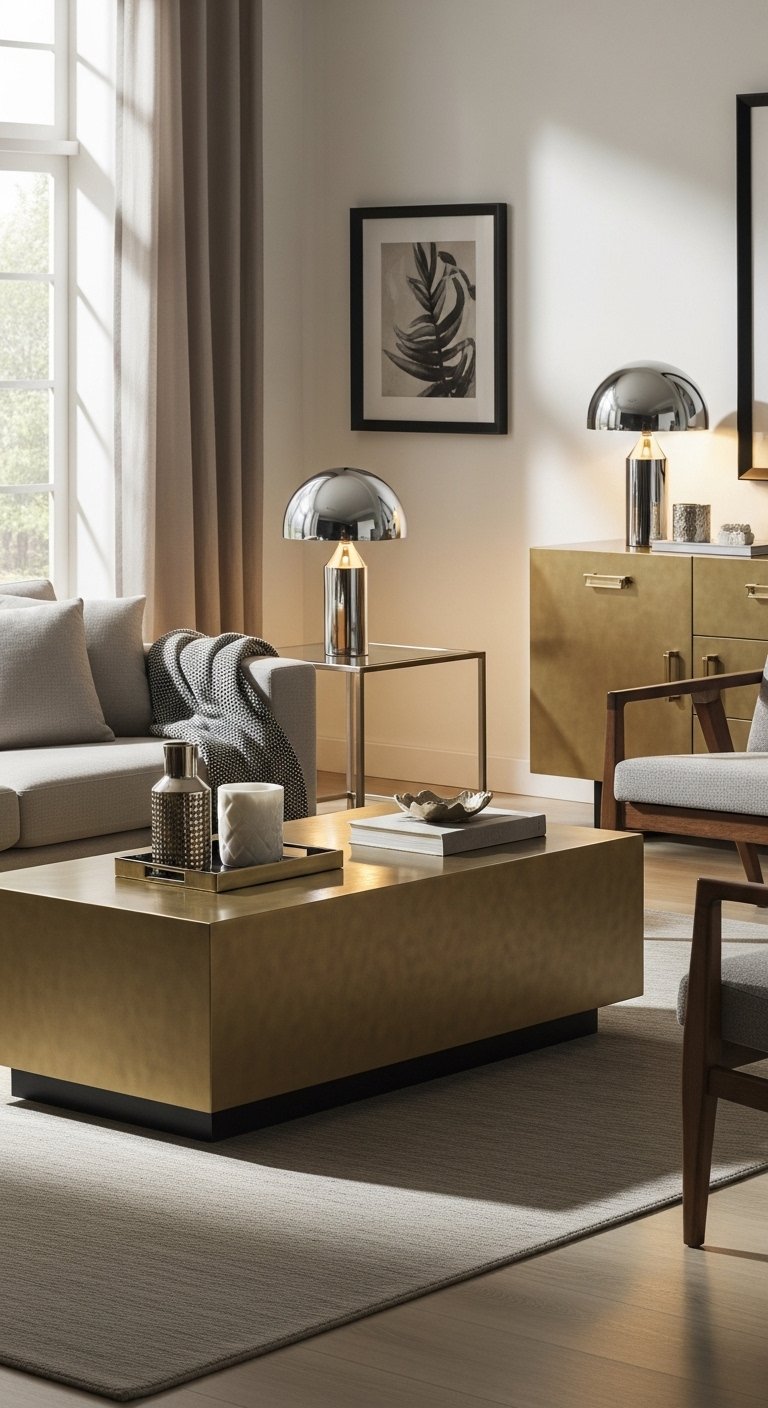 Introduce metallic accents in subtle ways to elevate the room’s sophistication. Brushed gold, matte black, or chrome finishes on lighting fixtures, coffee tables, or shelving hardware create luxurious highlights. Combine metals with natural textures like wood or stone to avoid coldness. A metallic side table or sculptural lamp can instantly upgrade the overall aesthetic, making your modern living room feel chic, curated, and ready for Pinterest inspiration boards.