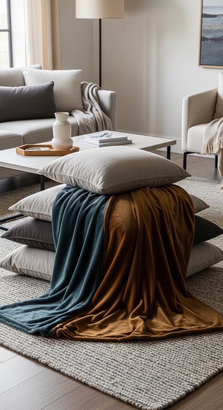Textiles offer a simple way to add warmth and personality without clutter. Layer cozy throws, patterned cushions, or woven poufs in complementary tones to create depth. Mix materials like linen, wool, and velvet for tactile interest. Draped over a sofa or chair, these textiles make the space feel lived-in yet modern. Pinterest users love seeing thoughtfully layered textiles that make a sleek living room feel comfortable and stylish simultaneously.