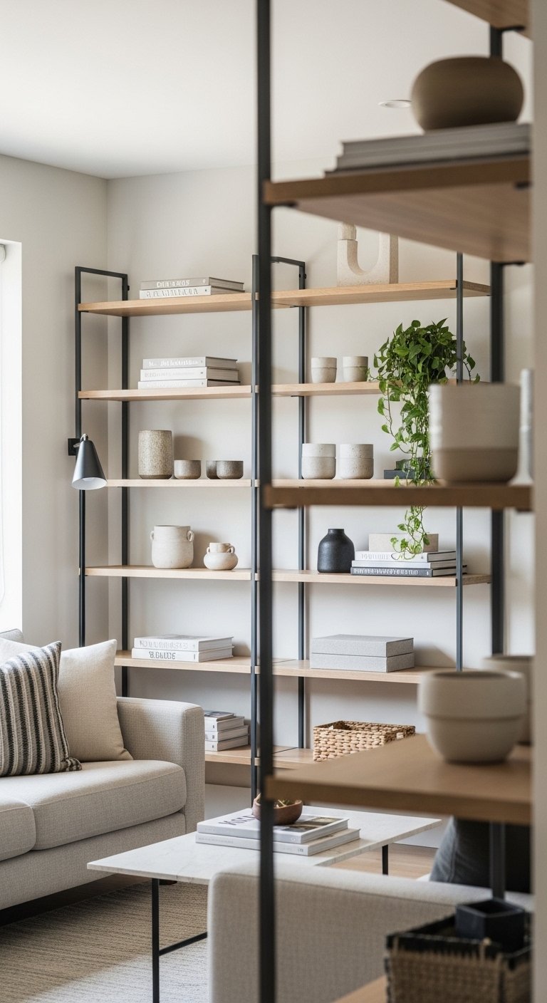 Replace bulky furniture with open shelving to display a curated mix of décor, books, and plants. Keep the arrangement minimal yet intentional—use a limited color palette and vary heights to maintain visual interest. Incorporate unexpected elements like sculptural vases or small framed art pieces to personalize the space. Open shelving allows the room to breathe while creating a visually compelling backdrop perfect for Pinterest-style photography.