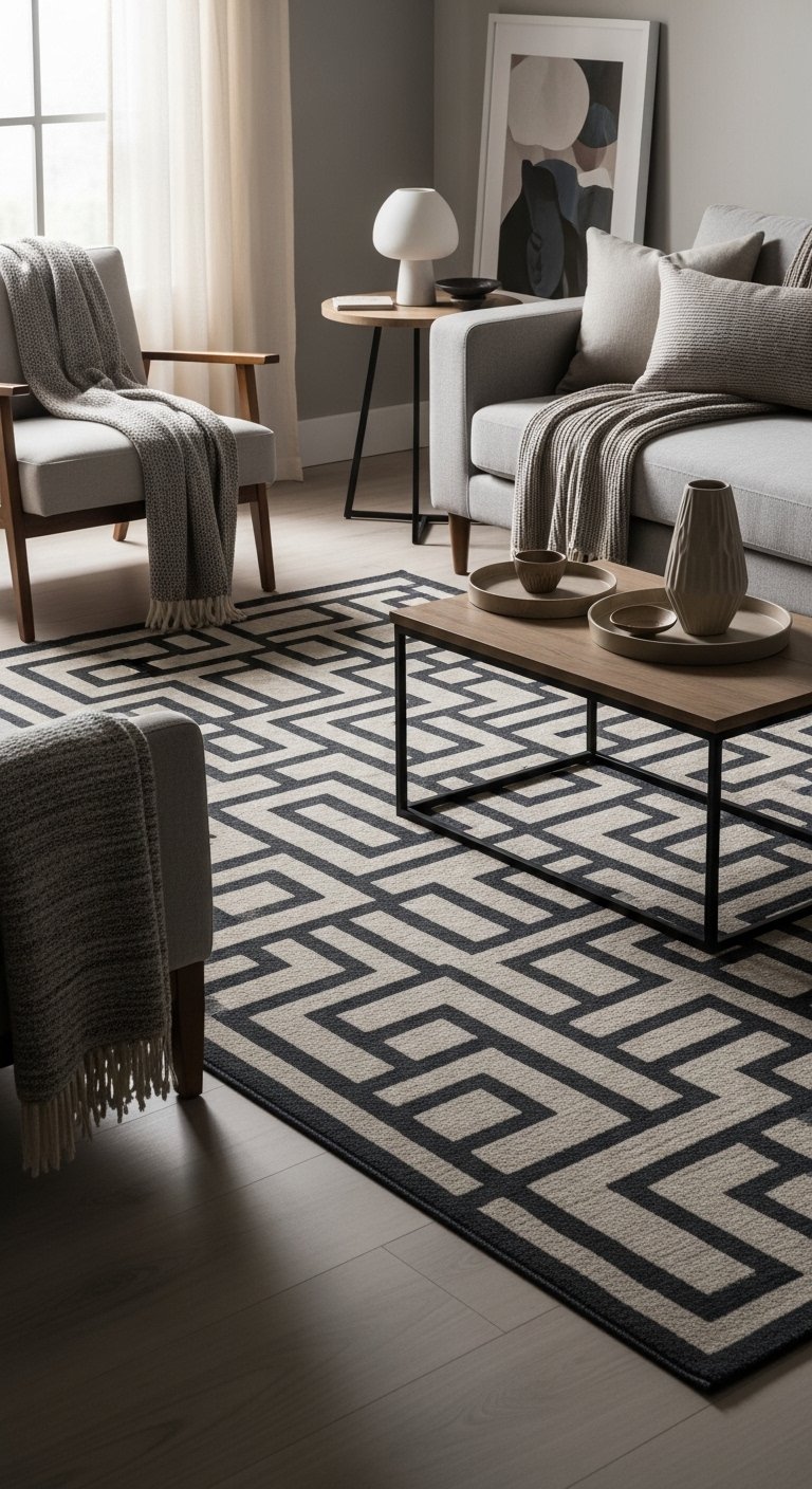 Anchor your living room with a bold, patterned rug. Geometric designs in contrasting colors—like black and white or muted tones with metallic threads—instantly modernize the space. Position the rug under a central seating arrangement to unify the layout. Pair it with minimalist furniture and neutral walls to keep the focus on the rug. Pinterest users often save spaces where rugs serve as both functional and aesthetic elements, adding personality without clutter.