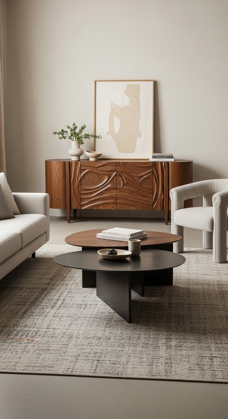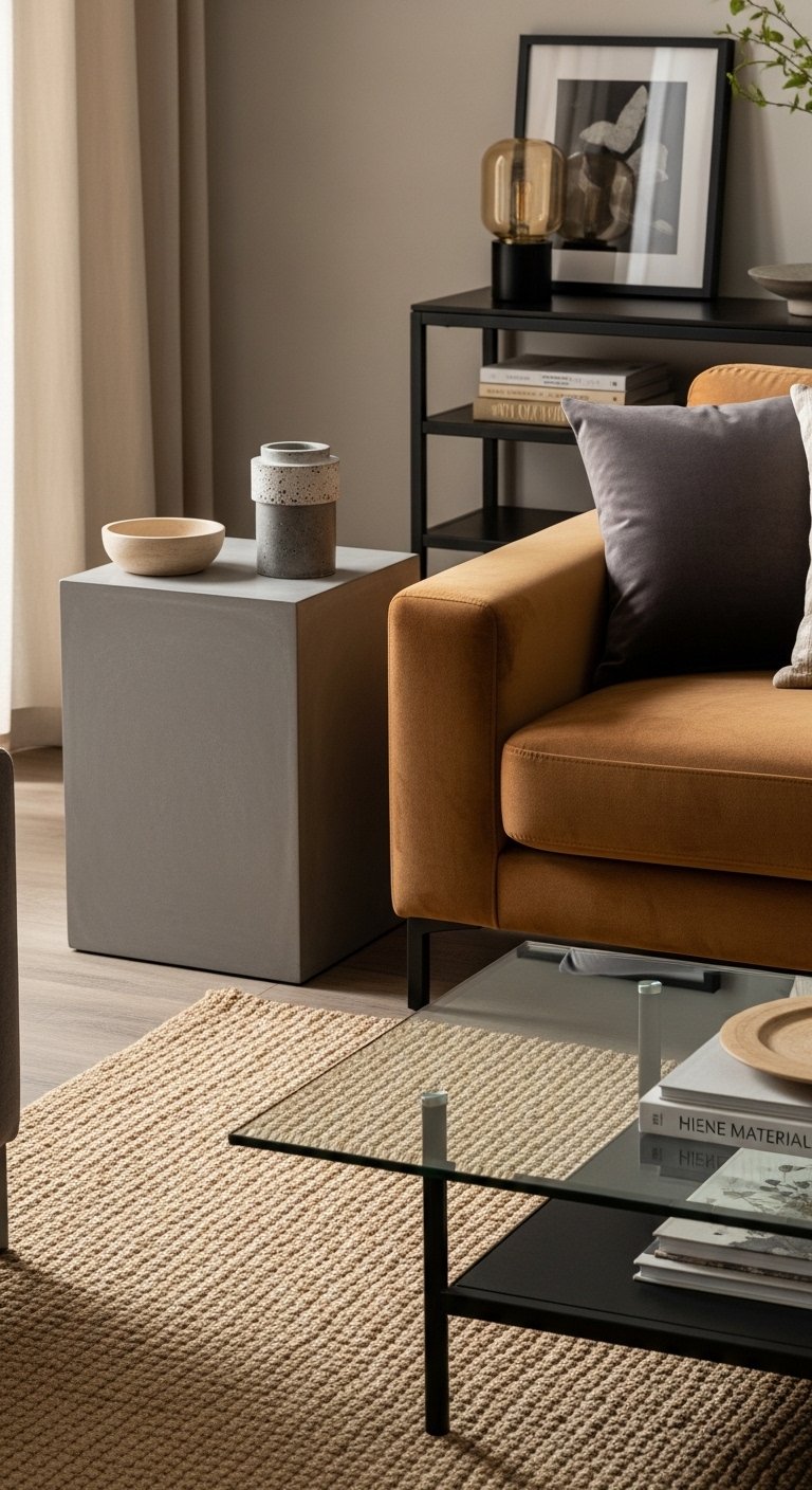 Modern style doesn’t mean monotony. Combine unexpected materials like a concrete side table with a velvet sofa, or a glass coffee table on a jute rug. Pair matte finishes with glossy ones, like a lacquered cabinet beside a raw oak console. This layering of textures creates tactile interest while maintaining a minimalist feel. Small touches, such as a marble tray on a steel table, can elevate the room’s sophistication. Pinterest users love seeing curated surfaces that feel intentional yet approachable.