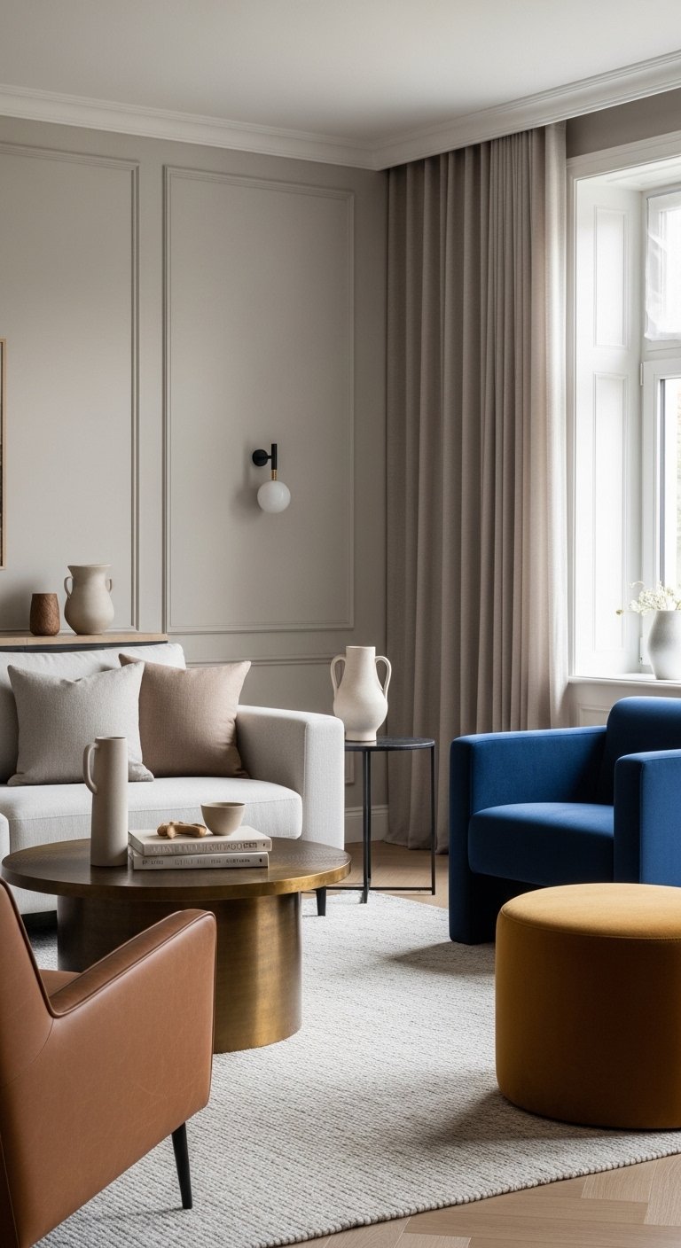 Start your living room with a soft neutral base—think shades of cream, taupe, or soft gray on walls and large furniture pieces. Layer different textures, such as a plush wool rug, linen cushions, and a sleek leather sofa, to create depth without clutter. Then, introduce bold accents like a cobalt-blue armchair or a sculptural mustard ottoman. The contrast creates visual interest and a Pinterest-ready photo moment. Add reflective surfaces such as a brass coffee table or mirrored side tables to bounce light and enhance the room’s sleek modern vibe.