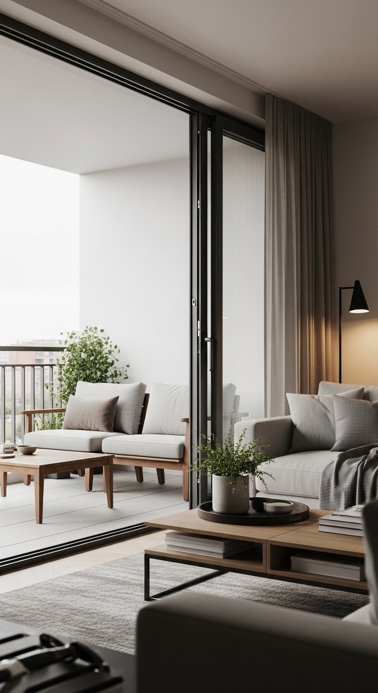 Maximize natural light and space by connecting your living room to outdoor areas. Large sliding doors, floor-to-ceiling windows, or a small balcony garden create a seamless indoor-outdoor flow. Use furniture and colors that complement the exterior space, like neutral tones, natural woods, or greenery. This approach not only expands the visual footprint but also brings in fresh air, plants, and sunlight, making the modern living room feel airy, open, and highly pin-worthy.