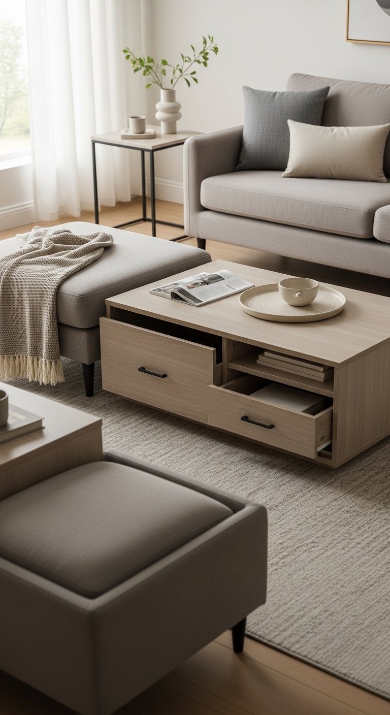 Modern living rooms benefit from clever, space-saving solutions. Opt for multifunctional furniture, like ottomans with hidden compartments, coffee tables with drawers, or benches that double as storage units. These pieces keep clutter out of sight while maintaining a clean, sleek aesthetic. Pair with minimalist décor and neutral tones to enhance the sense of openness. Hidden storage solutions not only improve functionality but also create a streamlined, Pinterest-worthy look that feels intentional and stylish.