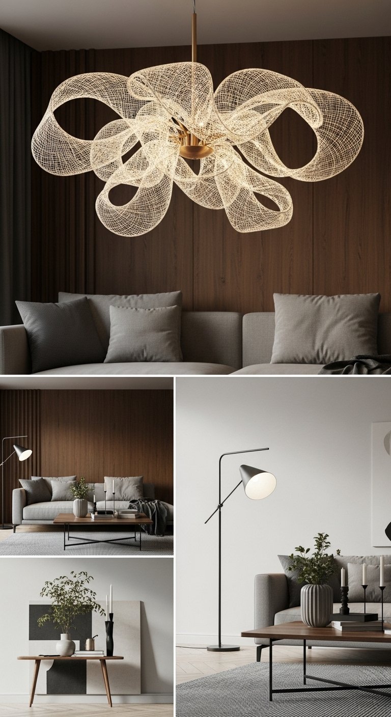 Instead of hiding your lighting, make it a centerpiece. Oversized pendant lights, sculptural chandeliers, or minimalist floor lamps can serve as both functional illumination and artistic statements. Choose pieces in matte black, brushed gold, or glossy white to maintain a modern aesthetic. Position a dramatic light over a central coffee table or reading nook to create a focal point. Layer with softer ambient lighting, like wall sconces or LED strips behind shelves, to balance functionality and mood. Pinterest-perfect lighting makes any room feel intentional and gallery-like.