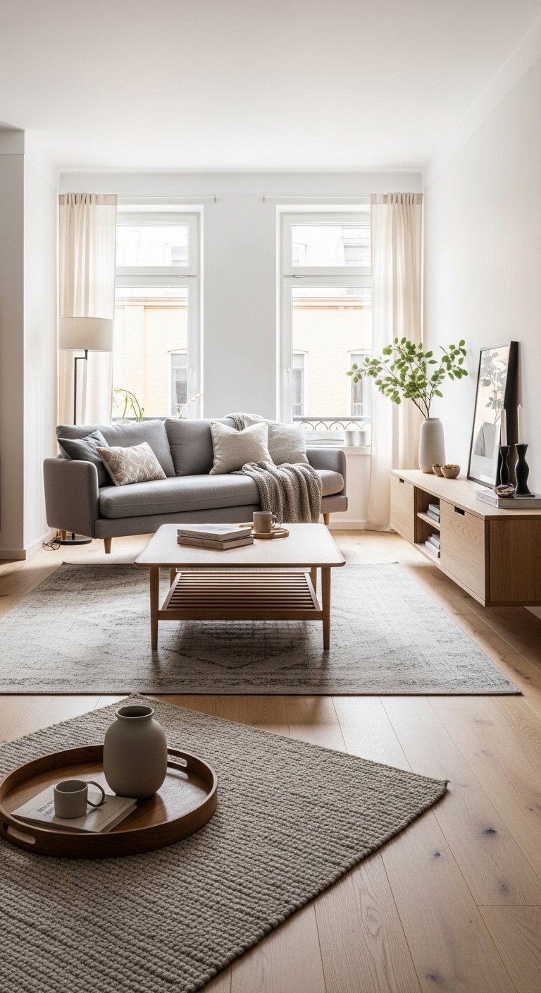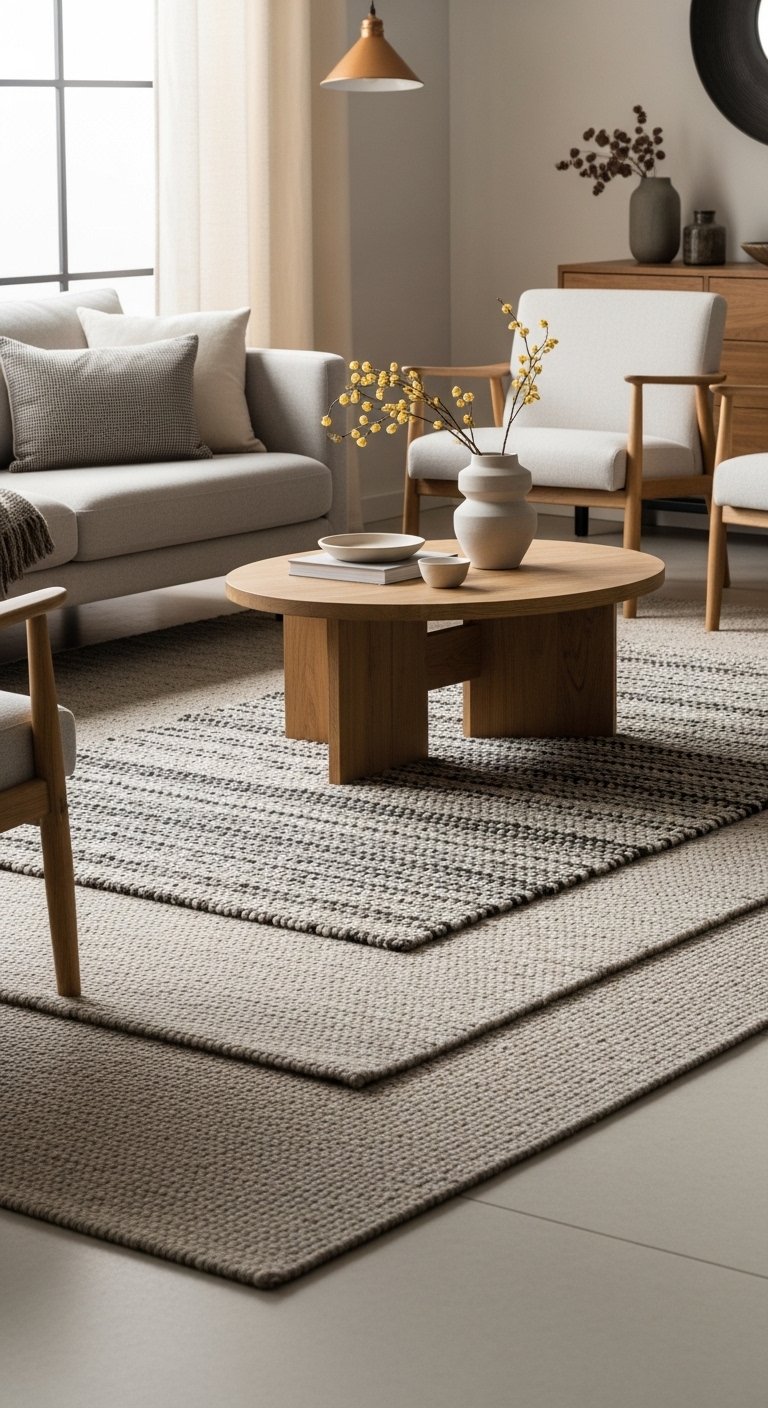 Instead of a single rug, layer rugs of different textures and patterns for a sophisticated feel. Start with a neutral base rug, then add a smaller, textured piece on top. This technique creates visual depth and highlights the furniture arrangement. Choose rugs with geometric patterns, natural fibers, or subtle metallic threads for a modern touch. Layered rugs also help define multiple seating areas in an open-plan space, making the room feel curated and intentional—perfect for lifestyle photography inspiration.