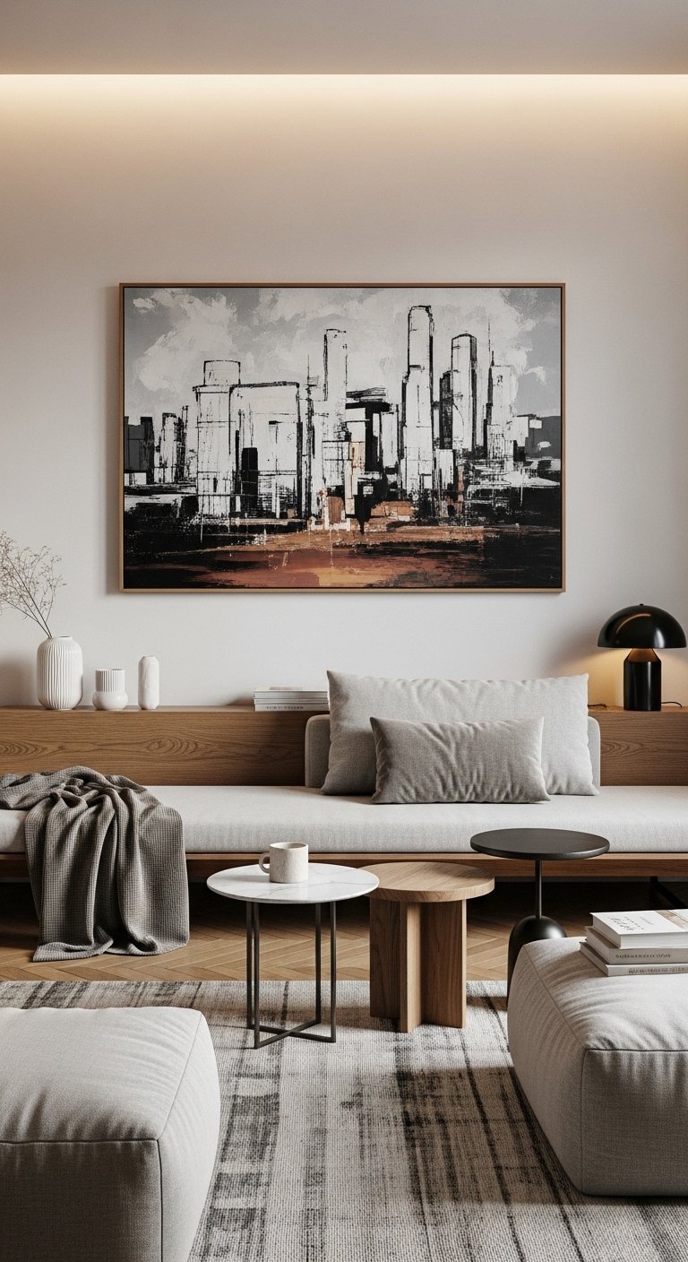 Replace traditional gallery walls with large-scale art or sculptural installations. A single oversized canvas in muted tones or a three-dimensional wall sculpture instantly elevates a modern living room. Consider asymmetrical arrangements or floating shelves with curated objects to add personality without clutter. Highlight the pieces with track lighting or picture lights to create a museum-like effect. This strategy draws the eye upward, making the room feel taller and more polished—perfect for Pinterest inspiration boards.