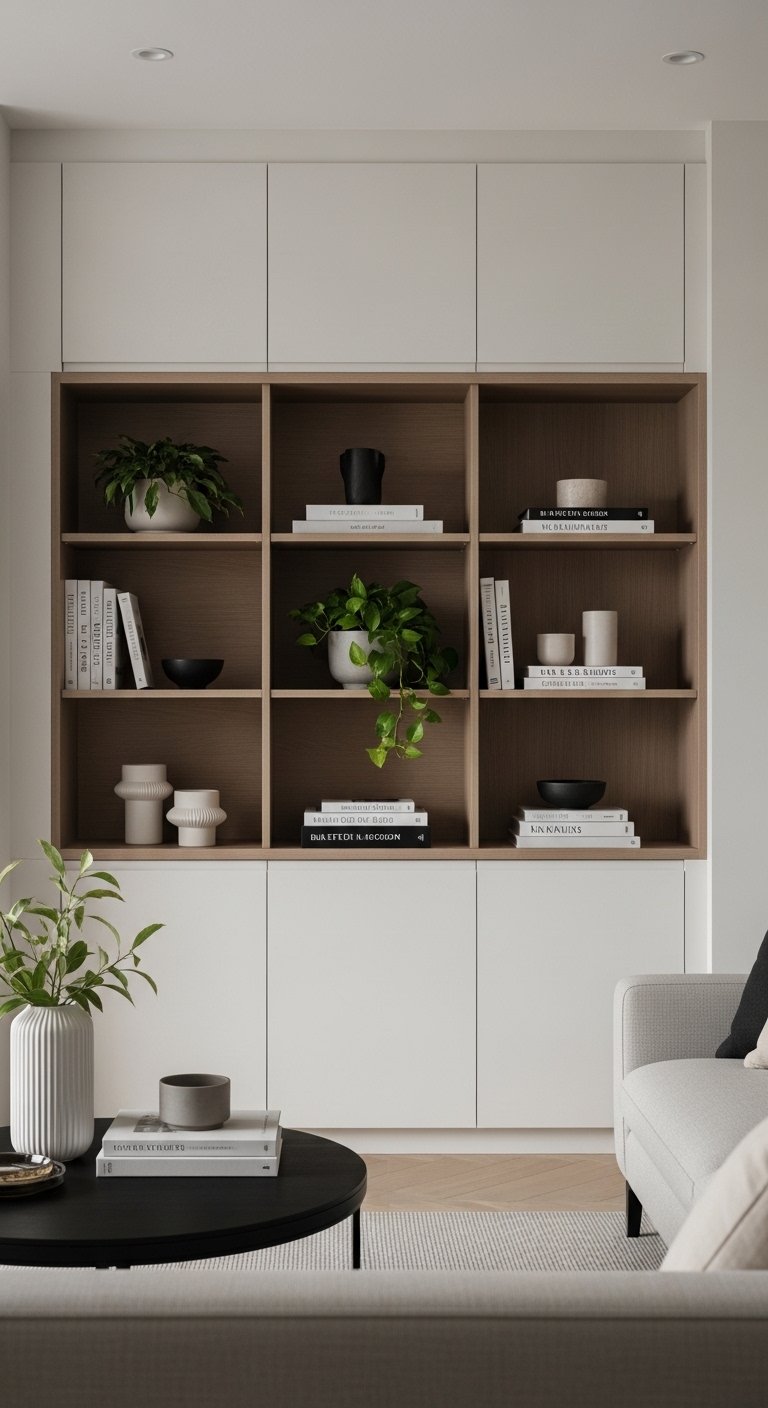 Modern living rooms often shine through clever storage. Built-in shelves and cabinets with clean lines hide clutter while displaying selected décor items. Opt for handleless cabinets in matte or glossy finishes to maintain a minimalist look. Integrate open shelves with lighting to showcase books, plants, or curated decorative items. A combination of hidden storage and open display keeps the space functional and photogenic. Pinterest users will notice the harmony between practicality and modern elegance.