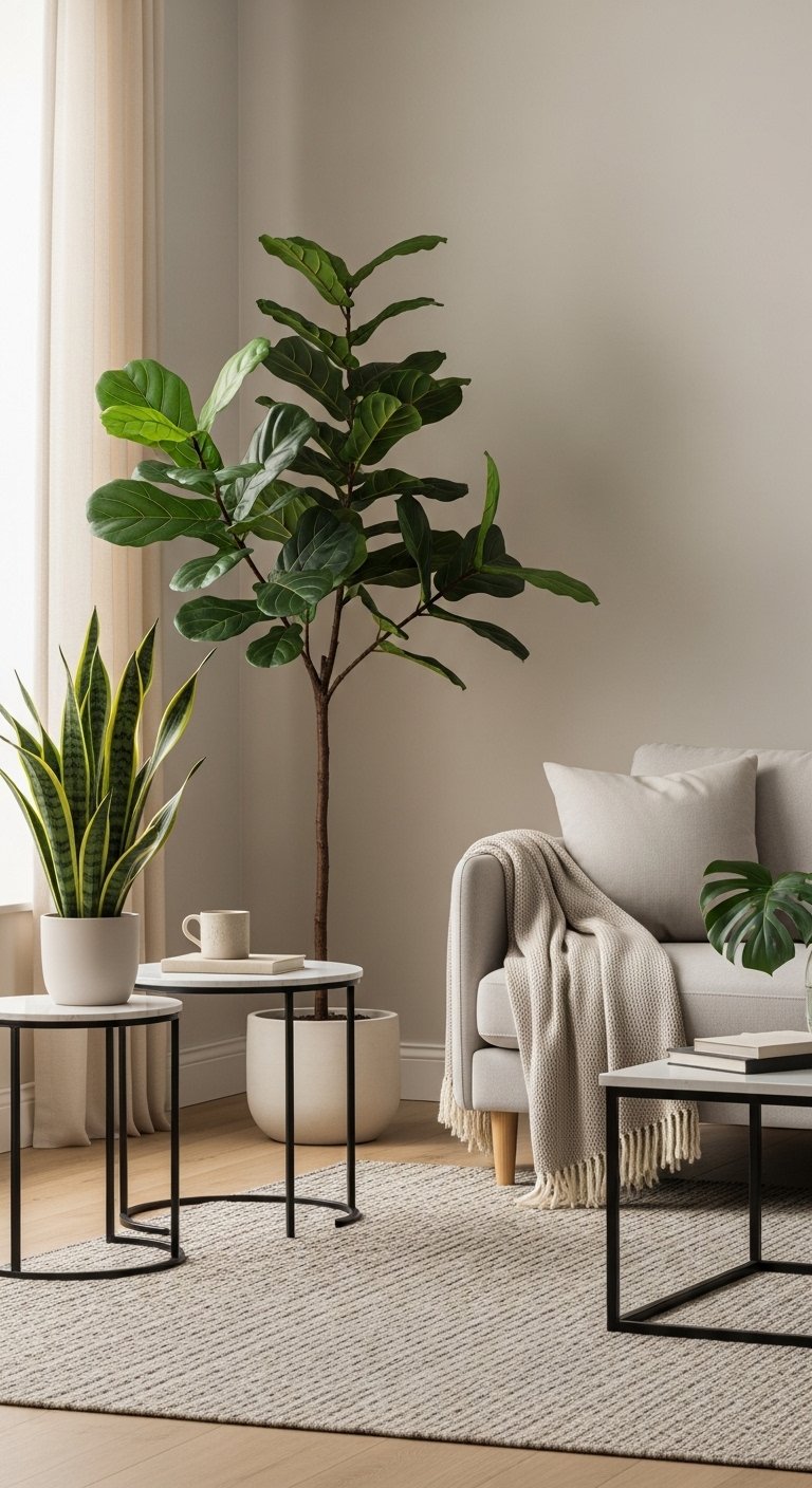 Incorporate plants as sculptural elements rather than just decorative items. Tall fiddle leaf figs, snake plants, or sculptural cacti add height and life while maintaining a clean, modern aesthetic. Use minimalist pots in monochrome colors or textured ceramics to complement your décor. Group plants in varying heights or place a single statement plant in a corner to create balance. Pinterest users love seeing greenery that feels intentional and modern, blending seamlessly with sleek furniture and neutral walls.