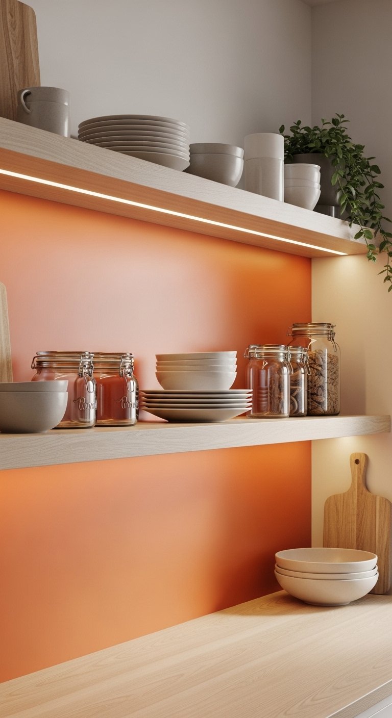 Adding orange to the back panel of open shelves is a smart and controlled way to introduce color. Instead of painting the entire wall, you focus the color inside the shelving area, creating depth and a layered look.Use a warm orange tone behind wooden or white shelves to make everyday items stand out. Plates, jars, and decor pieces will look more interesting against the colored background. This also adds a subtle design feature without taking over the whole kitchen.Keep the items on the shelves simple and neutral so the orange panel remains visible. Warm lighting above or below the shelves can enhance the effect. This idea is perfect for adding personality in a small but impactful way.