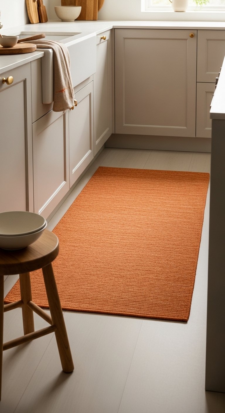 An orange rug adds warmth and comfort to your kitchen while also bringing in color. Choose a textured or patterned rug with orange tones mixed with neutral shades to create a balanced look.Place the rug near the sink or in a walkway area where it can be both functional and decorative. The texture adds softness, making the kitchen feel more comfortable and less hard.Pair the rug with simple surroundings so it becomes a subtle focal point. Natural light will bring out the color during the day, while warm lighting enhances it at night. This idea is perfect for renters or anyone looking for an easy and affordable update.