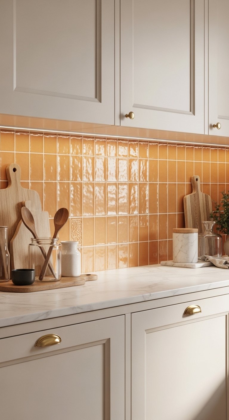 3. Orange Tile Backsplash with Subtle Pattern Play