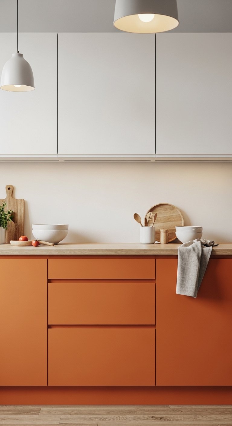 Two-tone cabinets are a modern design choice that adds depth and personality to your kitchen. Using orange on the lower cabinets while keeping the upper cabinets white or cream creates a balanced and visually pleasing layout. The lighter upper section keeps the space feeling open, while the orange base adds warmth and grounding.Choose a muted orange shade so it blends naturally with other elements in the kitchen. Pair it with a light wood or marble countertop to soften the contrast and keep the design elegant. This setup is also practical because lower cabinets handle more wear, and deeper colors help hide marks and stains.Add warm pendant lights above your counter or island to enhance the orange tone and create a cozy glow. This idea is perfect for anyone who wants to use color in a smart and controlled way.