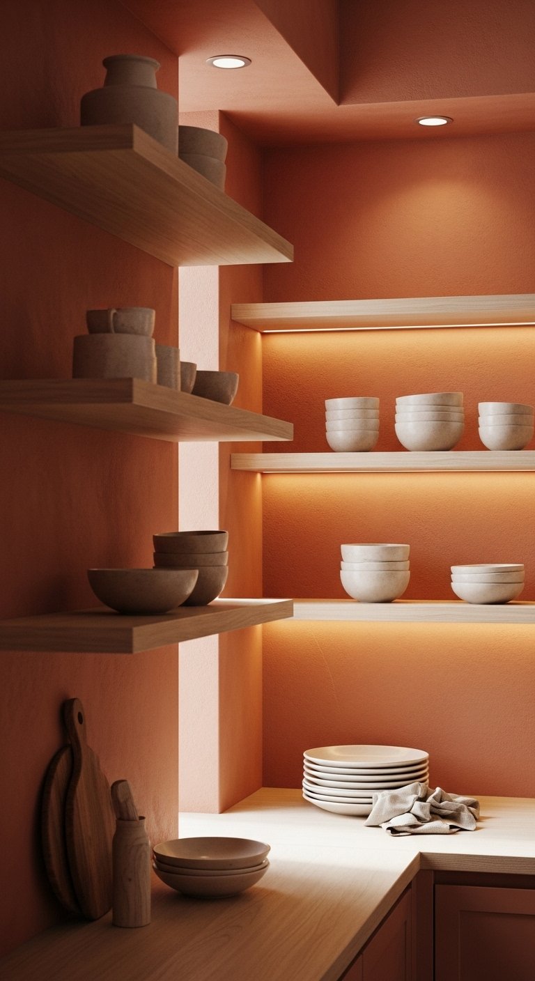 6. Terracotta Walls with Open Wooden Shelves