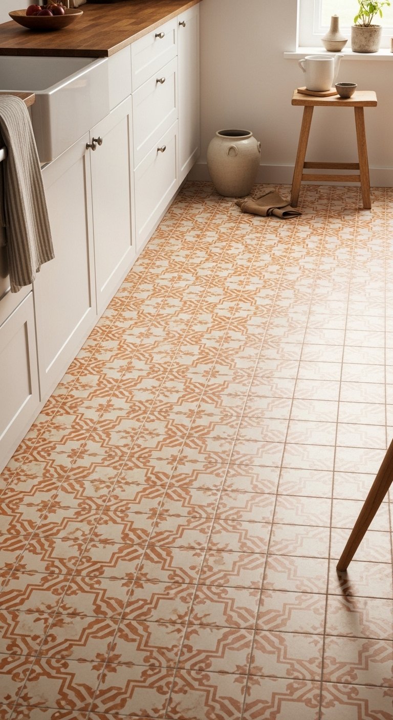 Patterned orange floor tiles can completely transform your kitchen by adding energy from the ground up. This idea is perfect if you want something bold without changing cabinets or walls. The floor becomes the main design feature, creating movement and personality in the space.Choose patterns that combine orange with soft white or light gray to keep the look balanced. This prevents the design from feeling too busy while still making a strong statement. Keep the rest of the kitchen simple with plain cabinets and minimal decor so the flooring stands out.Natural light enhances the pattern during the day, while warm lighting brings out the richness of the orange tones at night. This idea is practical, unique, and perfect for creating a kitchen that feels lively and different.