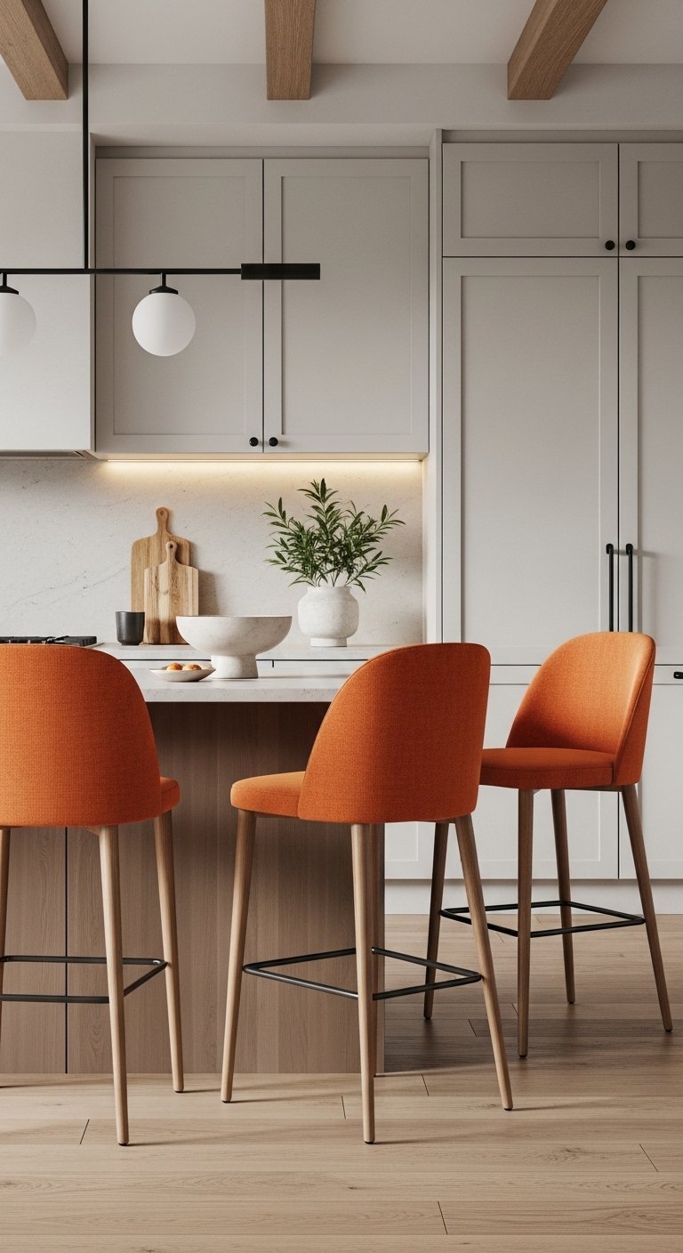 Orange bar stools are one of the easiest ways to add color to your kitchen without making permanent changes. They instantly brighten the space and create a focal point around your island or counter. This is a great option if you want a quick update with a strong visual impact.Choose materials that match your style, such as soft fabric for a cozy look or smooth plastic for a modern feel. Muted orange shades create a calm vibe, while brighter tones add more energy and fun. Pair the stools with neutral surroundings so they stand out naturally.You can also add a small matching decor item like a bowl or vase nearby to create a balanced look. This simple change can make your kitchen feel fresh and more inviting.