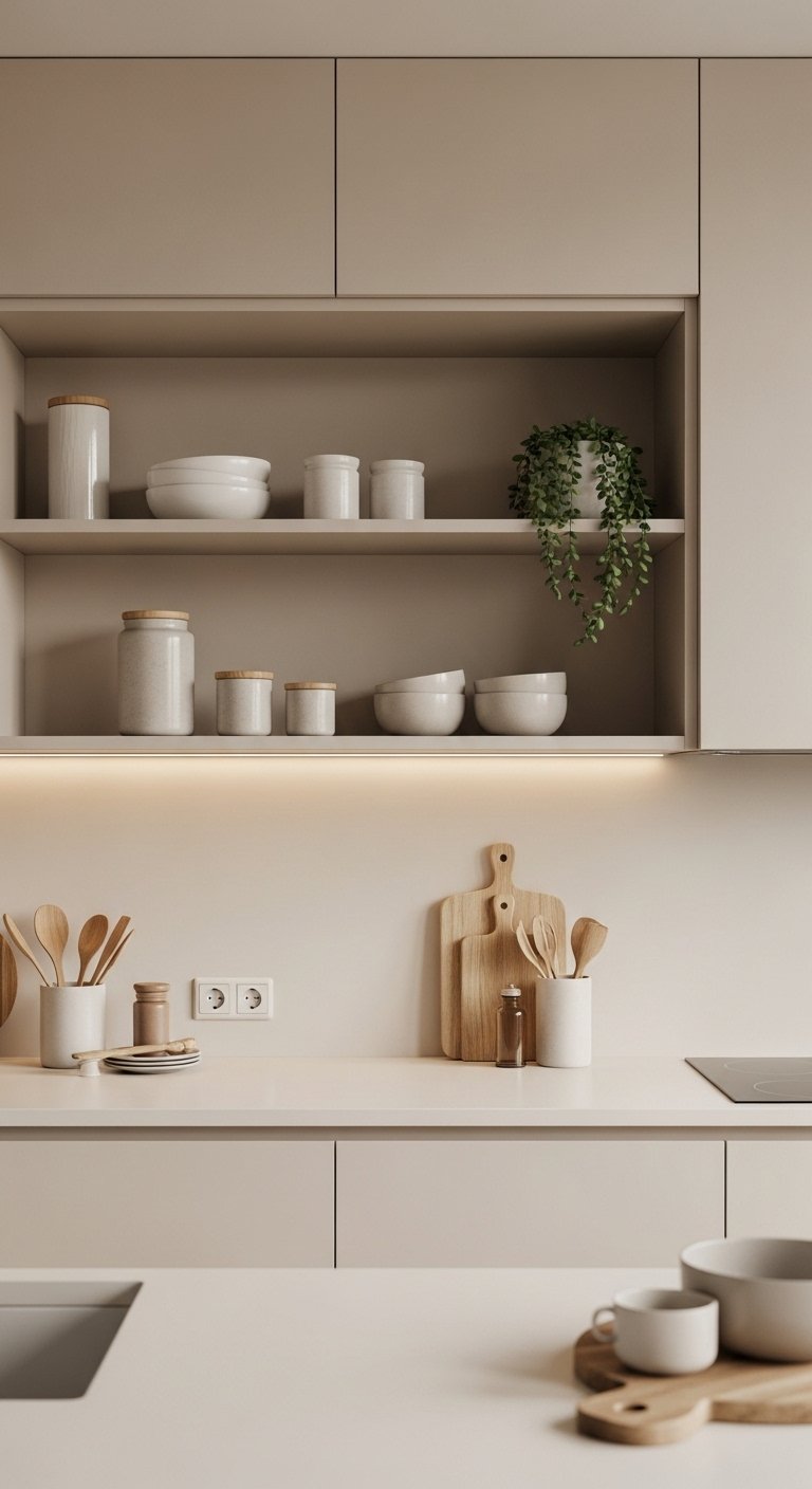 For a modern, airy vibe, embrace a minimalist beige kitchen with open shelving. Replace upper cabinets with light wood or beige shelves to display neutral ceramics, glass jars, or woven baskets. Keep countertops clutter-free, and let subtle textures—linen towels, wooden spoons, and small greenery—add warmth. Pair with soft, matte beige cabinets and natural light to maximize openness. This approach highlights the beauty of beige while making the space feel functional, uncluttered, and inviting. By focusing on practical, Pinterest-friendly styling, you achieve a kitchen that is modern, warm, and visually inspiring without feeling sterile.
