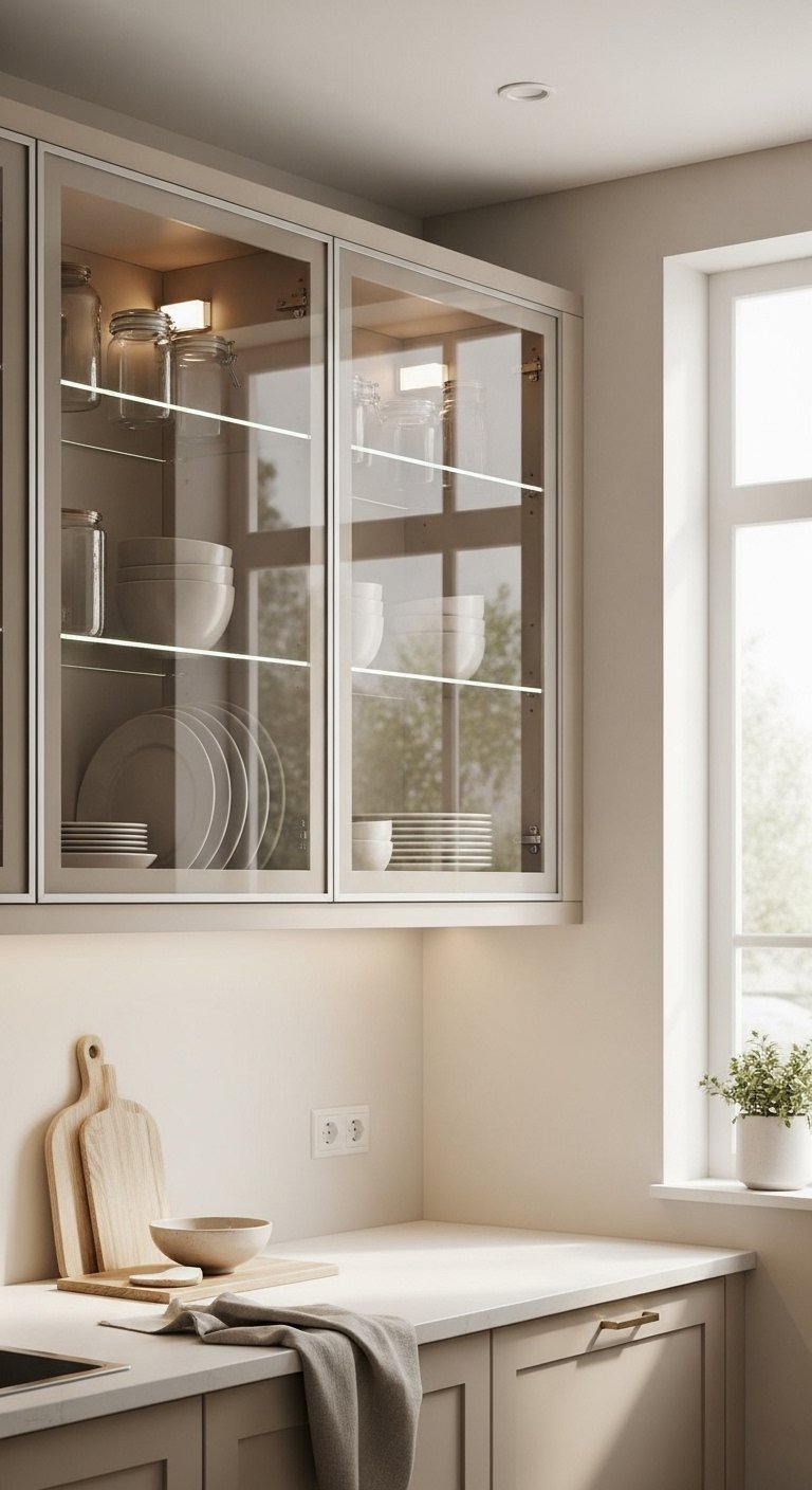 Add visual lightness to your kitchen by choosing beige cabinets with glass front doors. This simple change breaks the solid look of cabinetry and introduces openness without removing storage. Use clear or lightly frosted glass to showcase neatly arranged white dishes, beige ceramics, or glass jars filled with pantry staples. Keep the interior organized and color-coordinated to maintain a calm, curated appearance. Soft interior cabinet lighting can highlight these displays, especially in the evening, creating a warm glow that enhances the beige palette. Pair with subtle brass or brushed nickel handles for a refined finish. This idea works beautifully in smaller kitchens, as the glass detail reflects light and prevents the space from feeling closed in while still keeping everything functional and stylish.