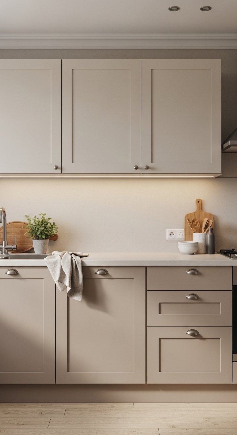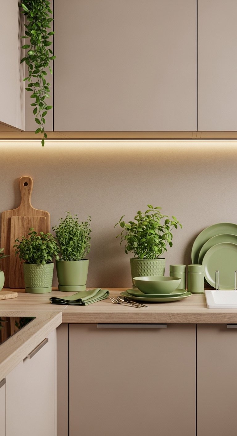 Bring life into your beige kitchen by incorporating soft green accents. Use indoor plants, green dishware, or even a muted sage backsplash to create a natural and refreshing contrast. Beige acts as a calm base, allowing green tones to stand out without feeling overwhelming. Choose plants like herbs on the windowsill or small potted greenery on open shelves for both beauty and function. Pair with wooden elements and natural textures to enhance the organic feel. This combination creates a fresh, balanced environment that feels connected to nature. It is an easy way to update your kitchen without major changes, while still achieving a modern and Pinterest-worthy look that feels lively yet grounded.