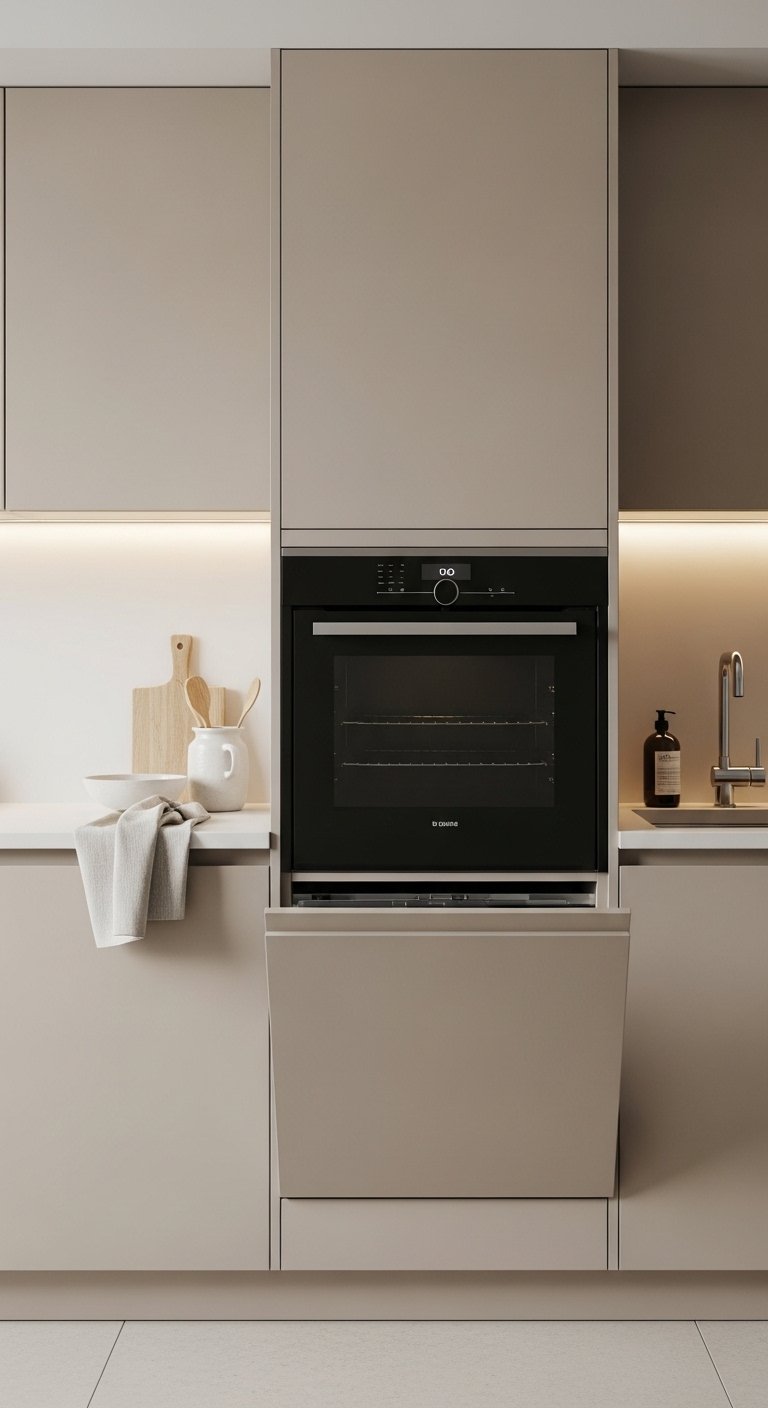 Create a sleek and modern kitchen by integrating appliances into beige cabinetry. Panel-ready refrigerators and dishwashers blend into the cabinets, creating a smooth, uninterrupted surface. This design makes the kitchen feel larger and more organized, especially in smaller spaces. Choose minimalist handles or handleless cabinets to enhance the seamless effect. Pair with a simple backsplash and neutral countertops to keep the focus on clean lines. Soft lighting under cabinets can highlight the smooth surfaces and add depth. This approach is perfect for those who love a clutter-free look while still maintaining warmth through the beige color palette. The result is a kitchen that feels polished, calm, and highly functional.