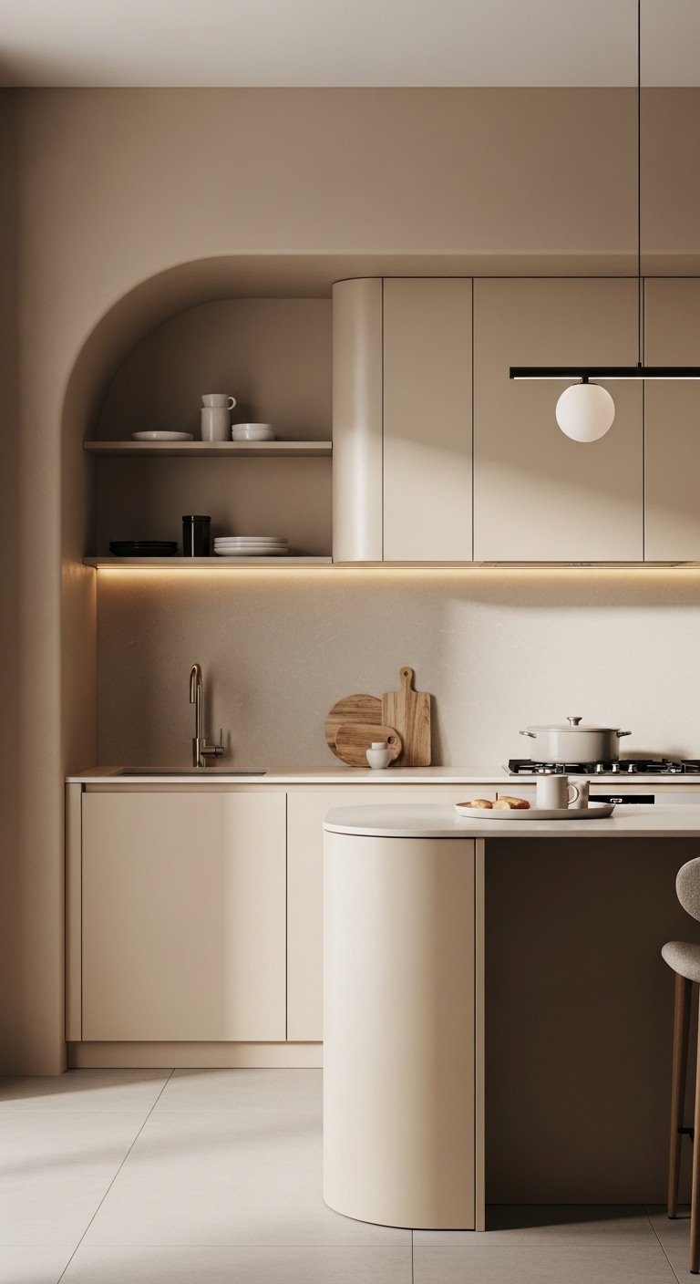 Introduce gentle curves into your beige kitchen to soften the overall look. Consider an arched doorway, curved island edges, or rounded open shelving. These shapes break the rigid lines of typical kitchen layouts and add a subtle sense of elegance. Beige tones enhance this softness, making the space feel more inviting and relaxed. Pair with smooth finishes like polished stone or matte cabinets to keep the design balanced. Even small details like curved bar stools or rounded lighting fixtures can reinforce the theme. This idea creates a unique and memorable kitchen that feels both modern and timeless, offering a fresh alternative to standard straight-line designs.