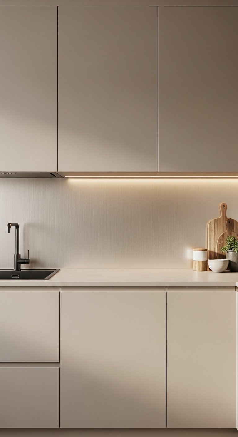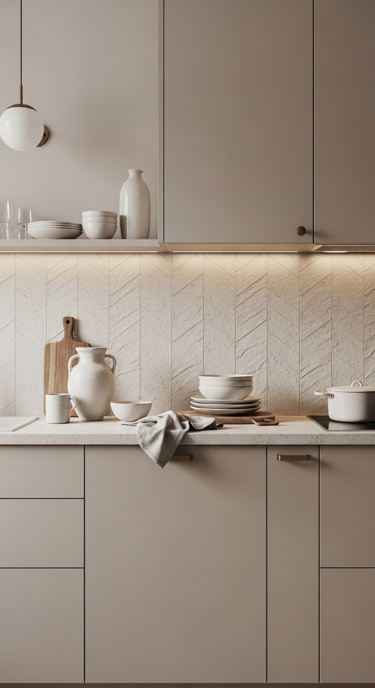 18. Beige Kitchen with Subtle Metallic Backsplash