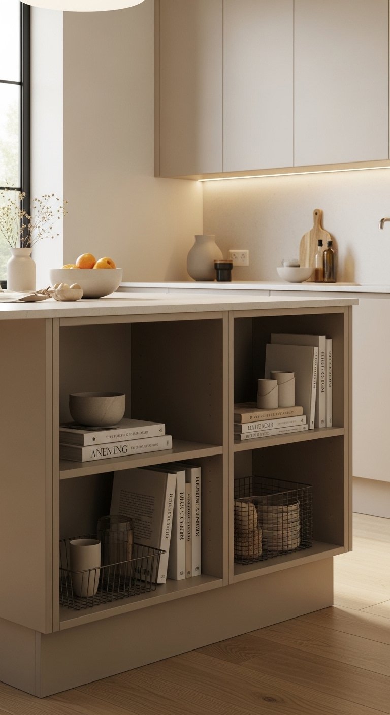 Make your kitchen more functional and visually interesting by designing an island with open storage. Use shelves or cubbies in a matching beige tone or natural wood to store cookbooks, baskets, or everyday items. This adds depth and makes the island feel more interactive and lived-in. Keep the styling simple and organized to maintain a clean look. Pair with a smooth countertop and subtle lighting to highlight the open sections. This idea not only improves storage but also gives you a chance to display textures and personal touches. It creates a balance between practicality and style, making your beige kitchen feel more dynamic and useful.