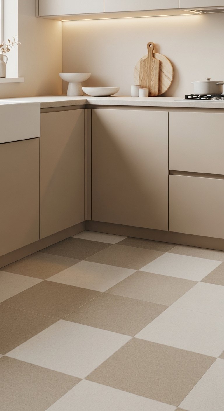 Add personality to your beige kitchen with a soft checkerboard floor in beige and white tones. This pattern introduces movement and visual rhythm without overwhelming the neutral palette. Choose muted shades instead of stark contrast to keep the look modern and warm. Pair this flooring with simple beige cabinetry and minimal hardware so the floor becomes the focal point. Light wood accents or woven textures can soften the geometric pattern and keep the space balanced. This idea works especially well in kitchens that need a bit of character while still staying calm and neutral. The checkerboard layout adds a subtle vintage touch while fitting perfectly into modern Pinterest aesthetics, making your kitchen feel unique yet timeless.