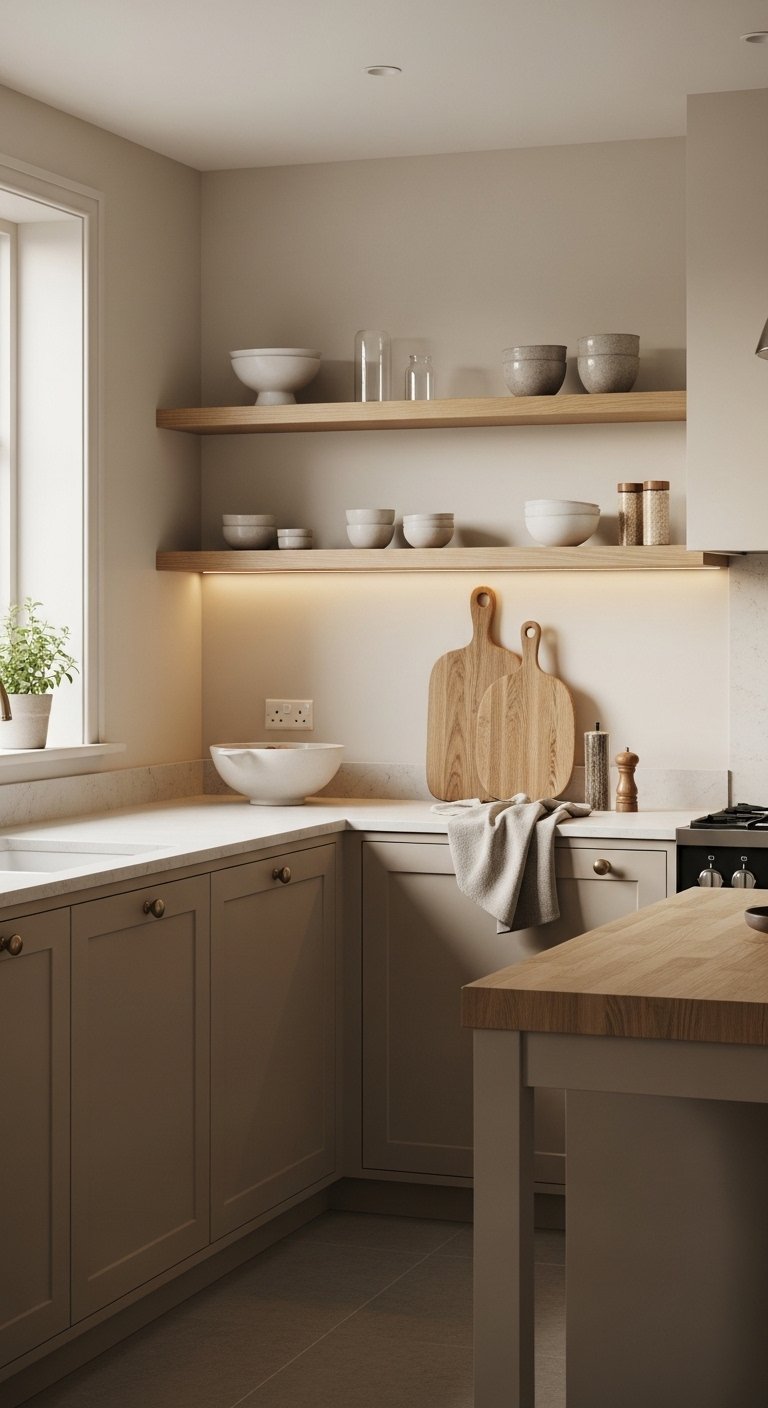 Bring depth to your kitchen by layering multiple beige tones across cabinets, walls, and countertops. Pair a soft sand-colored cabinet base with a slightly warmer taupe backsplash for subtle contrast. Introduce natural wood accents through floating shelves, cutting boards, or a butcher block island countertop. These wooden elements add warmth and tactile texture, preventing the beige palette from feeling flat. Let sunlight bounce off pale beige walls to illuminate your cooking area, while under-cabinet lighting highlights the wood grain. Small touches like wicker baskets or wooden utensil holders reinforce the natural, earthy feel. This approach makes the kitchen cozy yet modern, balancing neutral colors with organic materials that are both functional and visually appealing.