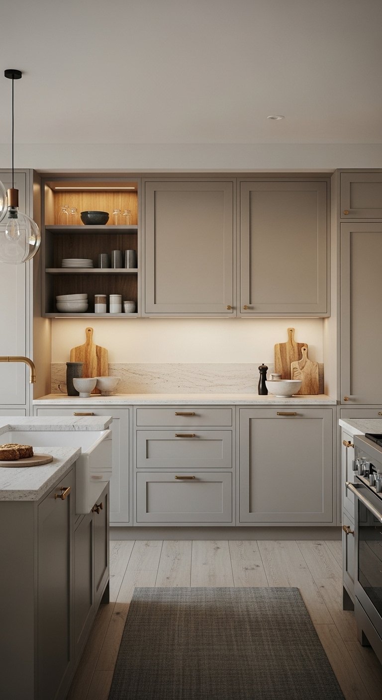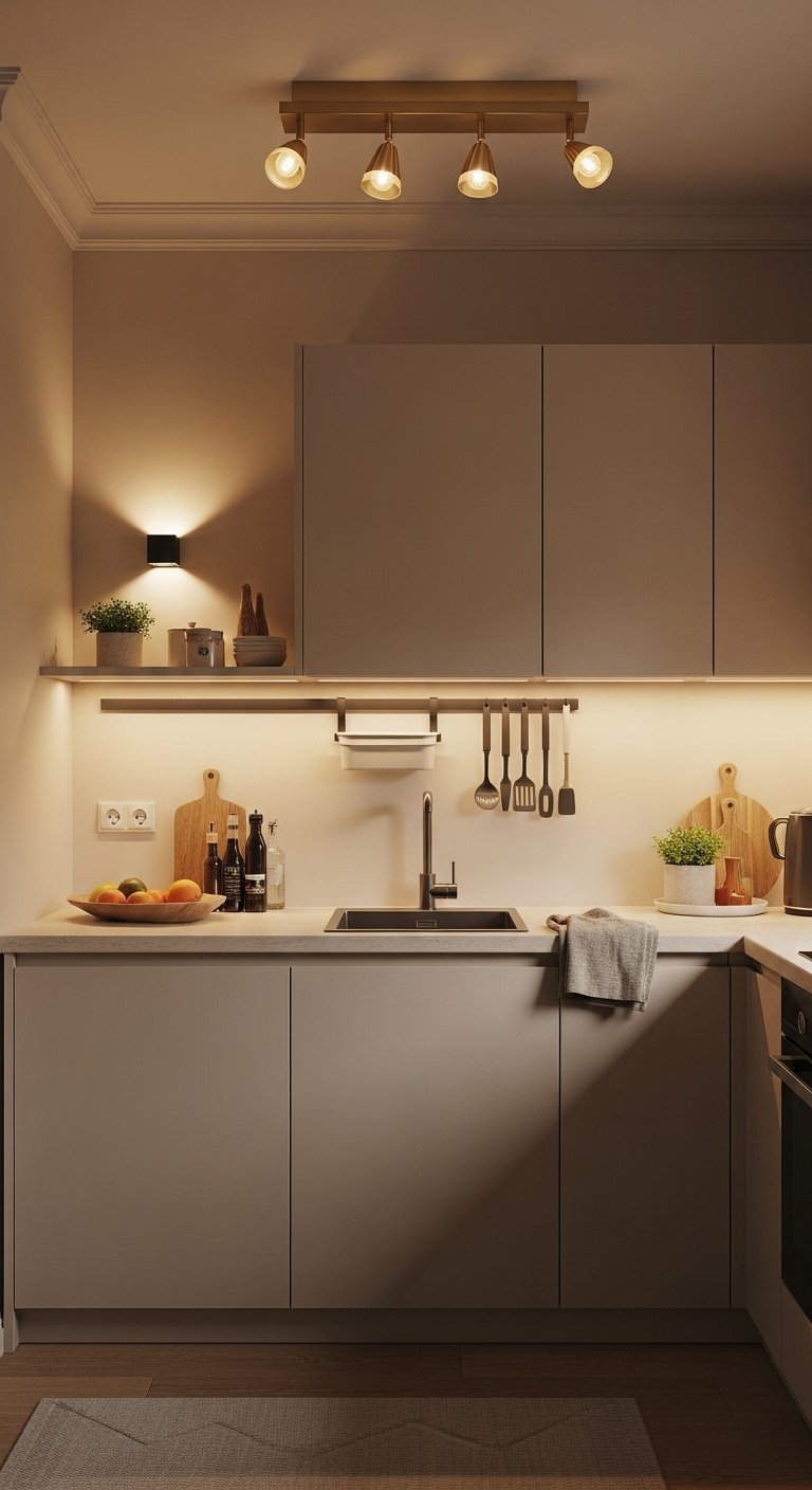 20. Beige Kitchen with Soft Ambient Layered Lighting