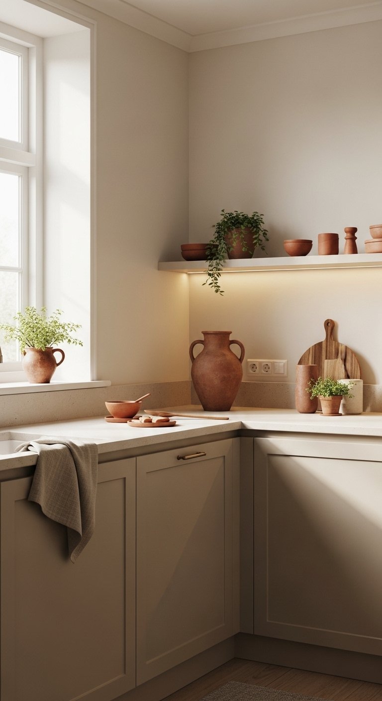 Introduce warmth and personality by pairing beige with soft terracotta accents. Use terracotta in backsplash tiles, planters, or decorative bowls to bring an earthy, sun-kissed tone into the kitchen. The warm orange undertone contrasts beautifully with neutral beige, creating a cozy and inviting atmosphere. Balance the look with light countertops and simple cabinetry to avoid making the space feel heavy. Natural materials like clay, wood, and linen enhance this palette and keep the design grounded. Even small touches like terracotta mugs or a clay vase can make a noticeable difference. This idea works especially well in kitchens that get plenty of sunlight, as the warm tones glow naturally throughout the day. The result is a kitchen that feels both relaxed and full of character.