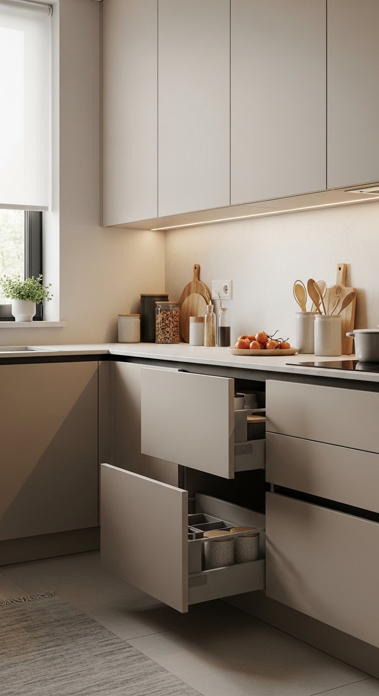 23. Beige Kitchen with Hidden Storage and Smart Organization