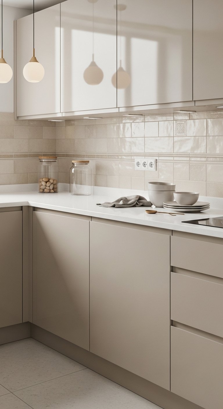 Create a high-resolution, ultra-realistic vertical image of a modern kitchen with matte beige cabinets paired with smooth glossy white countertops. Add a subtle beige tiled backsplash with a simple pattern. Style with a glass jar, a neutral dish set, and a soft cloth. Use natural daylight with gentle warm pendant lighting around 2700K. Keep the composition clean with visible breathing space and a slightly angled human perspective. Ensure realistic reflections on the countertop and soft shadows, avoiding any harsh contrast or artificial effects.