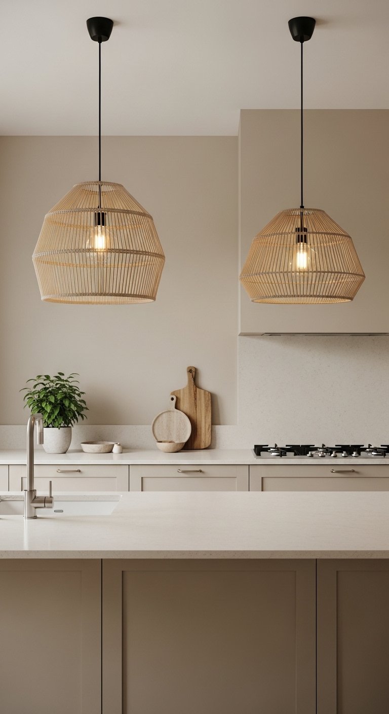 Transform your beige kitchen by adding bold, statement pendant lights above the island or dining area. Choose fixtures in materials like rattan, glass, or brushed metal to introduce texture and contrast. Warm-toned lighting enhances the beige palette, making the entire space glow softly during evening hours. Keep the rest of the kitchen simple so the lighting stands out without clutter. For a cohesive look, match the finish of the pendant lights with cabinet handles or faucets. The right lighting not only improves function but also acts as a design feature that draws attention upward. This idea is perfect for adding personality and depth to a neutral kitchen while maintaining a clean and modern feel that looks stunning in photos and real life.
