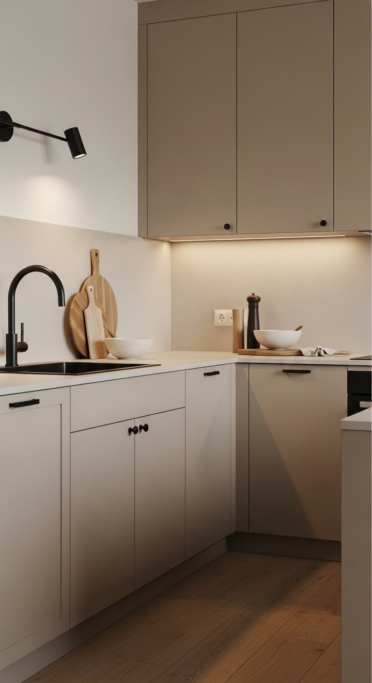 Introduce a touch of drama by combining beige cabinets with black accents. Black hardware, lighting fixtures, or open shelving brackets add modern sophistication and contrast sharply against the soft beige backdrop. A black faucet or matte black stove enhances the statement without dominating the room. Balance these bold touches with warm wood flooring or neutral countertops to prevent the space from feeling stark. This combination works well in both traditional and contemporary layouts, giving a neutral kitchen a polished, designer-inspired feel. The result is a warm, modern space where beige’s softness is complemented by subtle, high-impact details that feel curated and Pinterest-perfect.