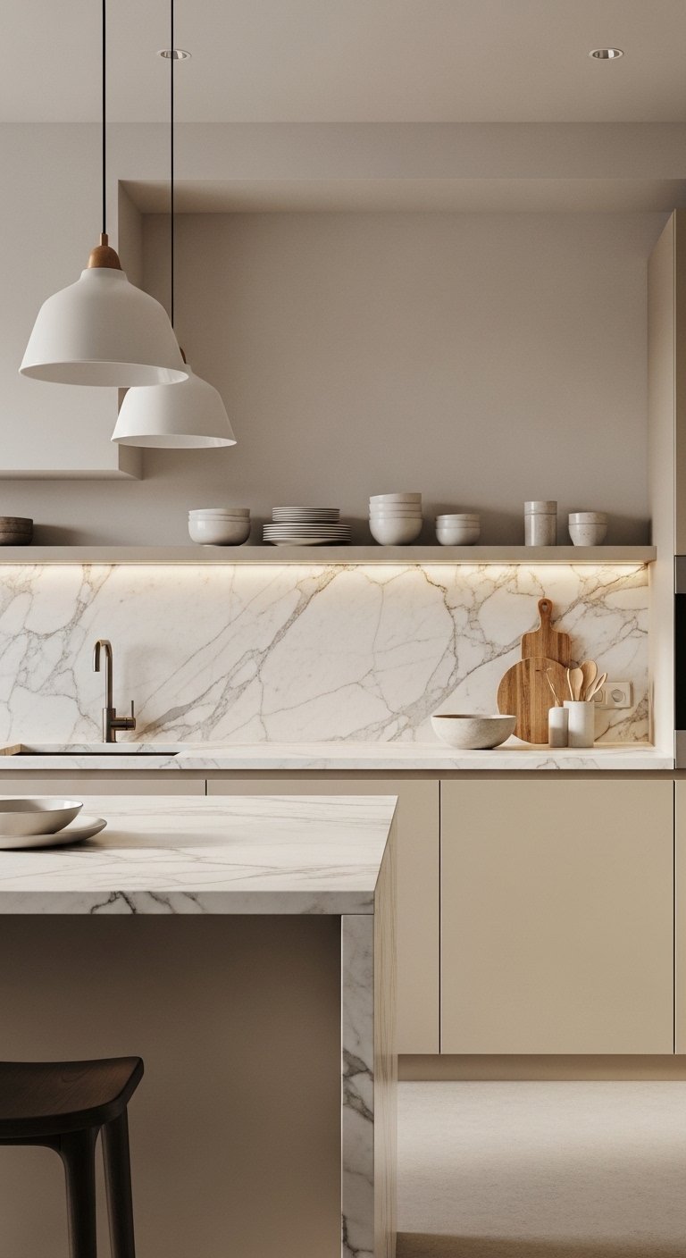 Beige cabinets paired with light marble countertops create a luxurious, timeless look. Choose marble with subtle gray or honey veining to maintain warmth while introducing natural variation. Beige-toned cabinetry frames the marble beautifully, and a matching backsplash ensures continuity. Add open shelving to display ceramic dishes, brass accents, or glass jars, making the space feel airy and inviting. Soft pendant lighting over the island highlights the natural veining, creating a sophisticated focal point. This combination balances elegance and warmth, turning a simple beige kitchen into a high-end, modern space that’s both functional and visually captivating.