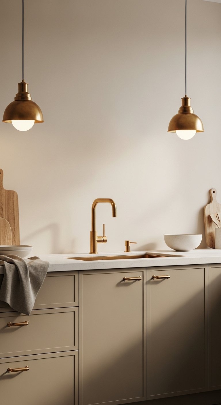Brass fixtures instantly elevate a beige kitchen by introducing a metallic glow that complements the soft warmth of beige cabinetry. Consider brass faucets, drawer pulls, lighting pendants, or even bar stools. Pair with marble or quartz countertops and a beige backsplash to maintain harmony. Brass accents reflect natural light and add richness without overpowering the neutral palette. Combine with wooden cutting boards, woven baskets, or linen textiles to keep the space inviting and tactile. This subtle infusion of luxury makes your beige kitchen feel intentional, modern, and Pinterest-worthy.