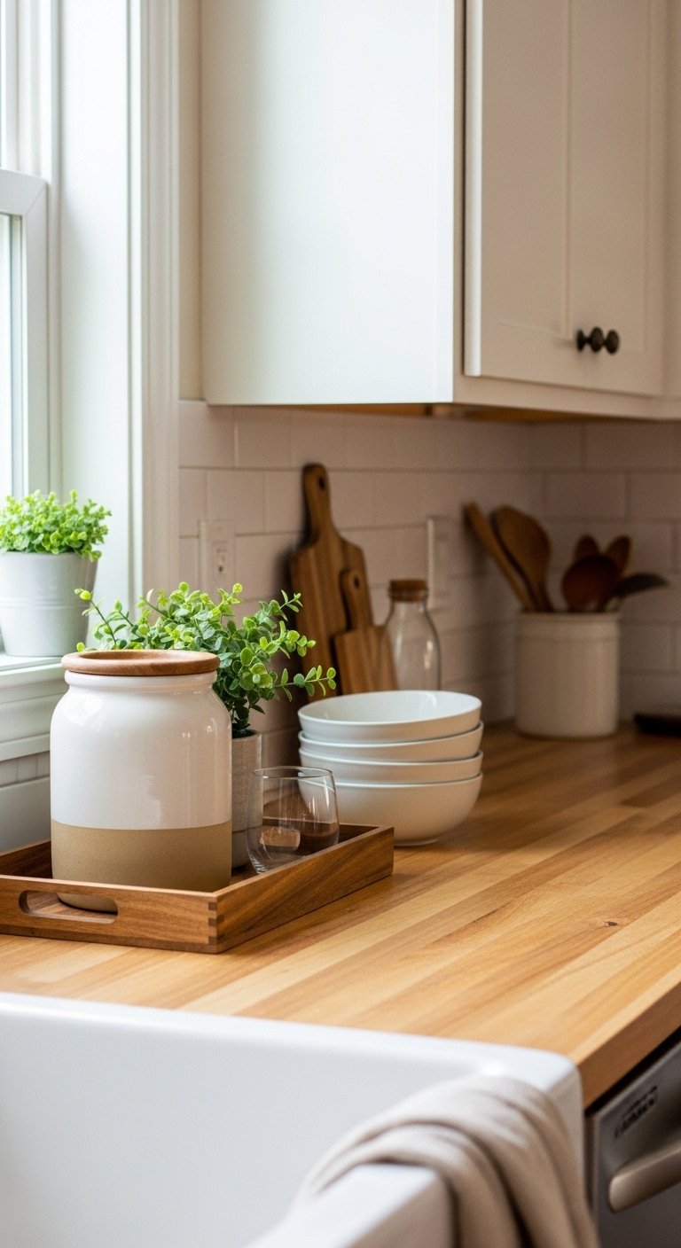 A clutter-free counter does not mean an empty one. The key is to style it with intention. Choose a few meaningful items that add warmth and function.Place a wooden tray with a ceramic jar, a small plant, and a stack of bowls. This creates a simple but inviting display. Avoid overcrowding the space so it remains easy to use daily.This approach keeps your kitchen looking clean while still feeling warm and personal. Every item should have a purpose, either functional or visual. This balance makes your farmhouse kitchen feel calm, organized, and welcoming.