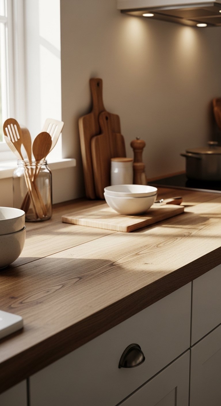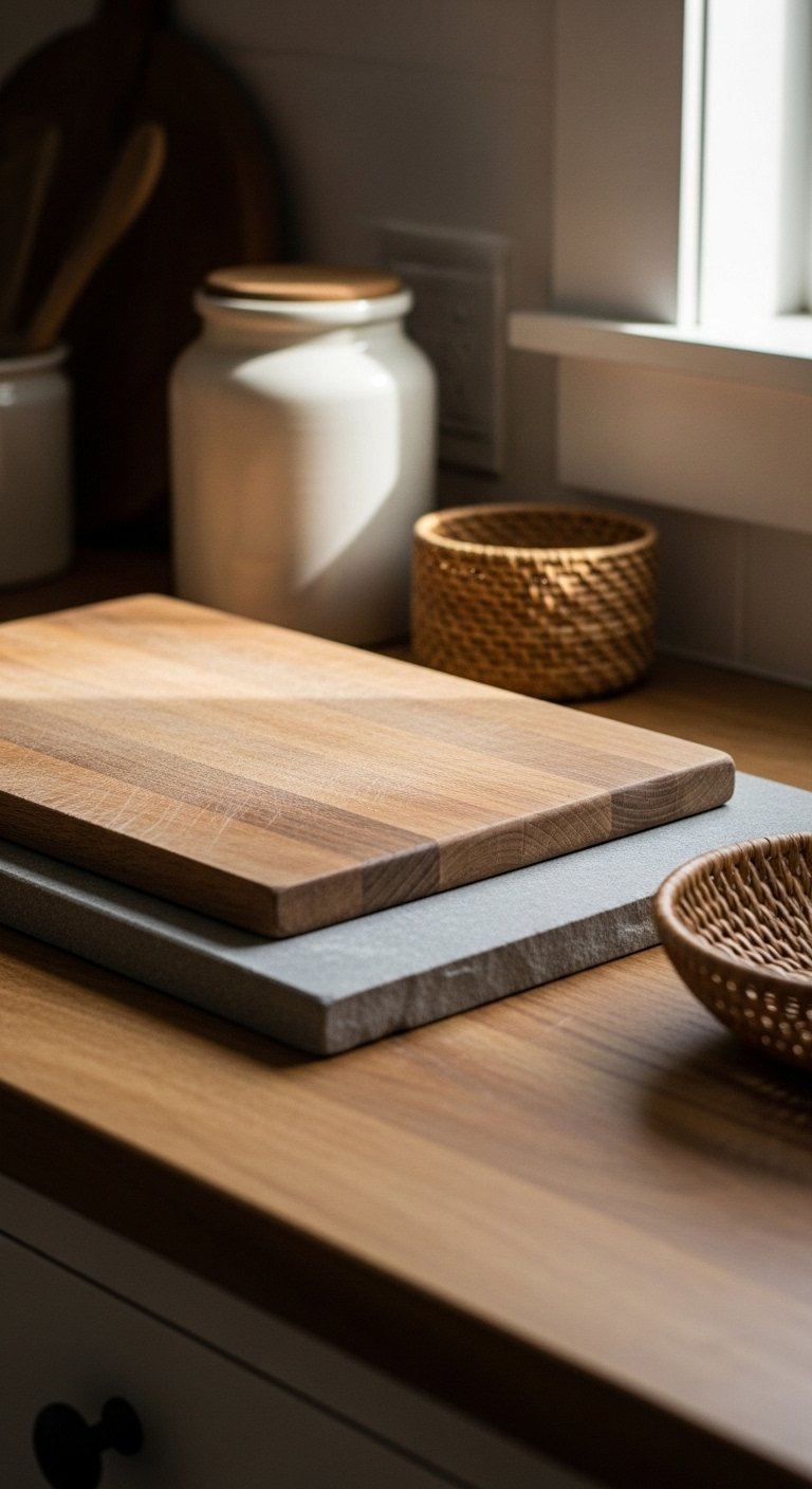 Instead of a single material, try layering different textures on your countertops. Pair a wooden cutting board over a marble slab or a woven tray over stone surfaces. This adds dimension without cluttering the space.Layering keeps your countertops visually interesting and emphasizes tactile warmth. Wooden accents create comfort, while stone adds solidity. Adding a small ceramic jar or a linen napkin completes the arrangement.This approach turns functional areas into styled vignettes that feel natural and inviting. Visitors notice these subtle touches and your kitchen will feel curated, cozy, and practical all at once.
