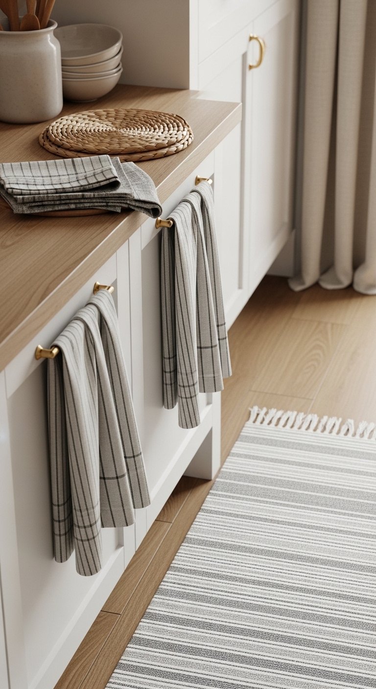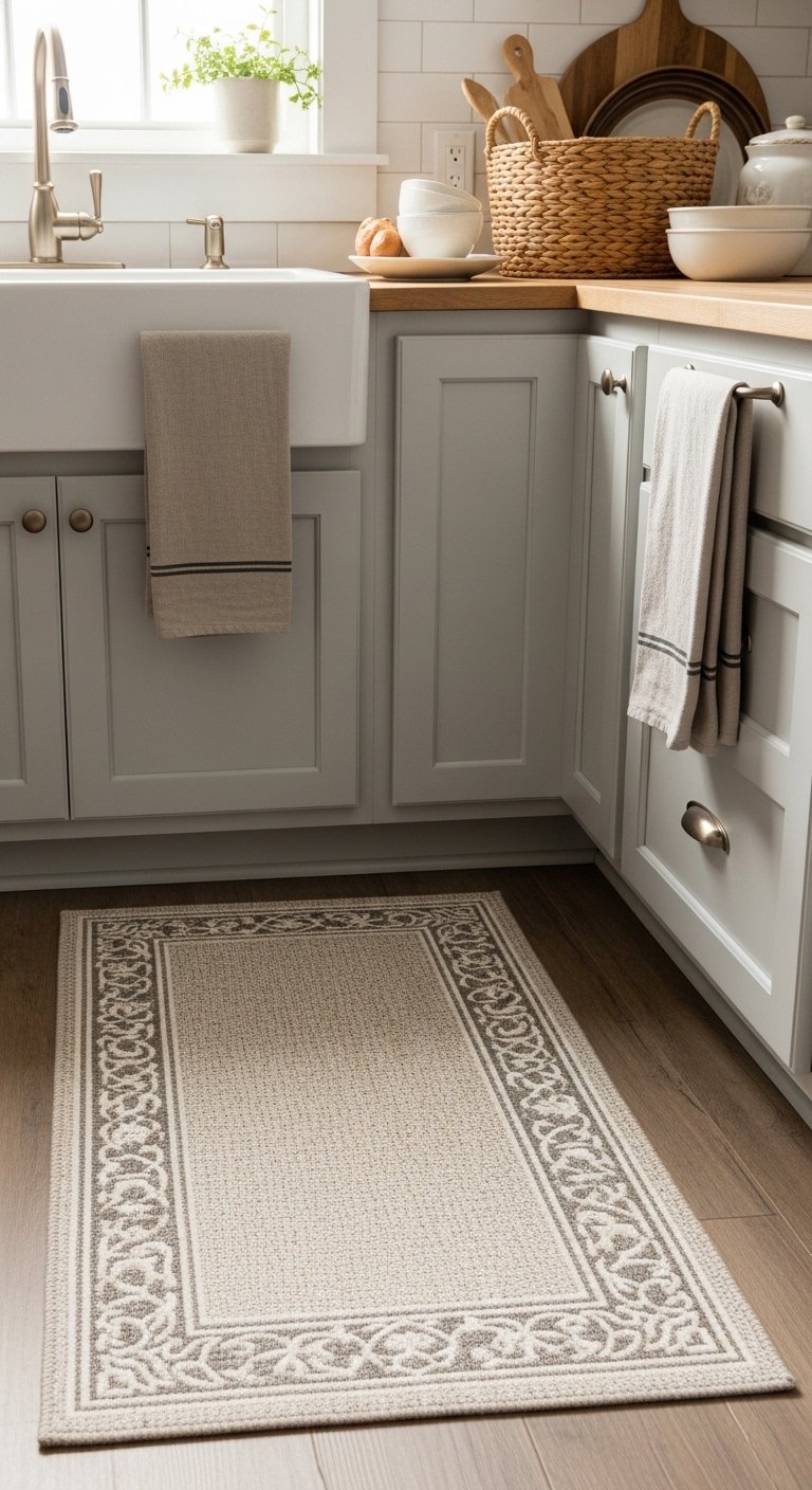 Farmhouse kitchens often have many hard surfaces like wood, stone, and metal. Adding textiles helps balance the space and make it feel softer. Use linen curtains, cotton dish towels, and a simple runner rug to introduce comfort.Choose fabrics in neutral tones or subtle patterns like stripes or small checks. These details add warmth without overwhelming the space. A soft rug near the sink or stove also makes daily tasks more comfortable.Textiles bring movement and life into your kitchen. They make the space feel less rigid and more welcoming, perfect for a home that feels lived in and loved.